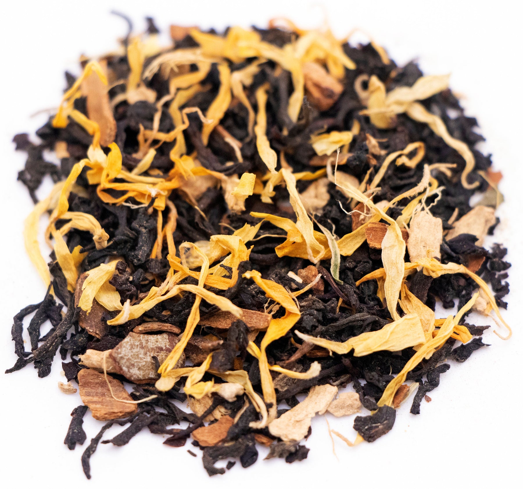 Ingredients: Black Tea, Ginger Pieces, Cinnamon Pieces, Cardamom, Black Pepper, White Pepper, Clove, Calendula Petals, Nutmeg, and Natural Vanilla Flavor