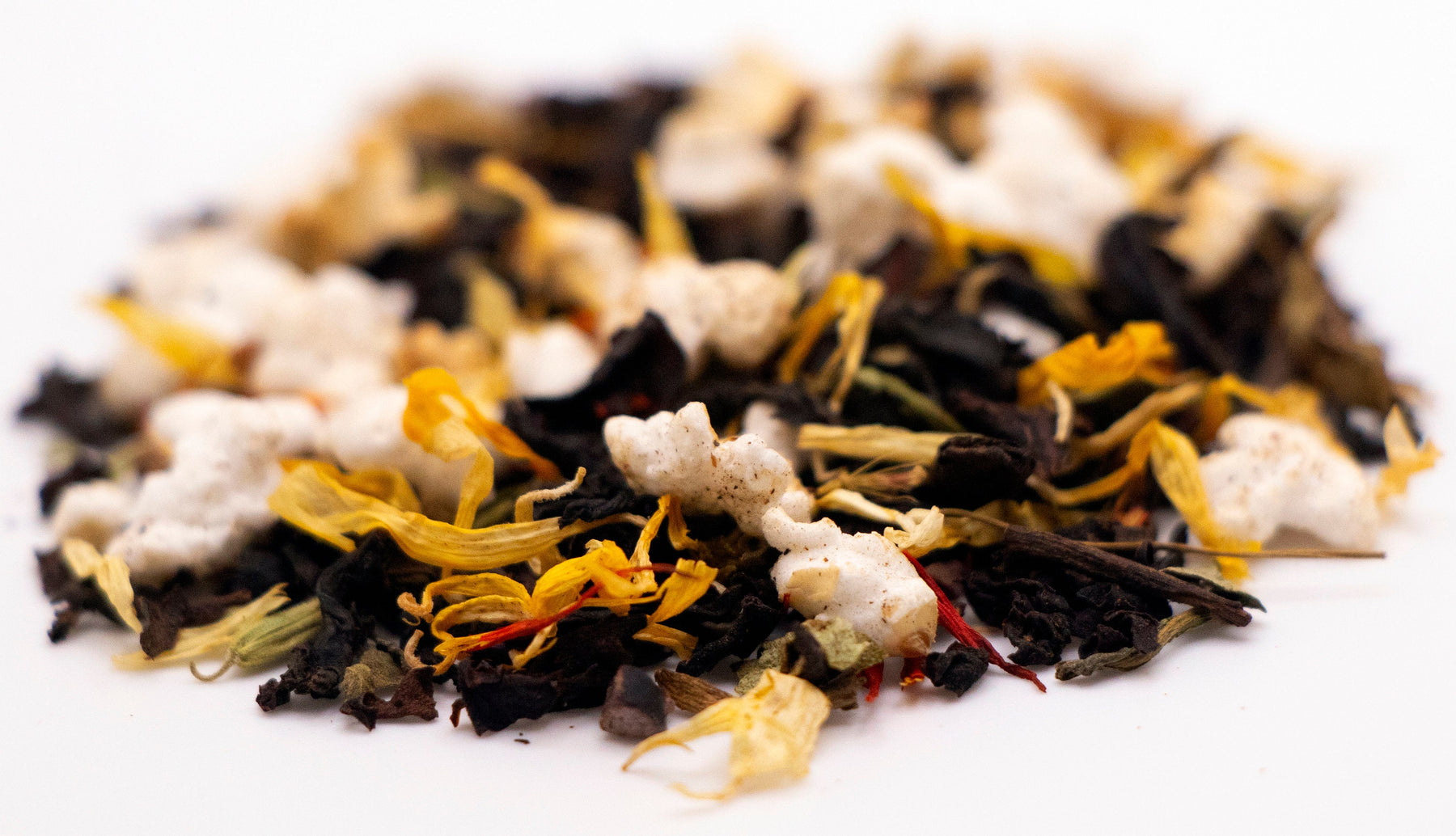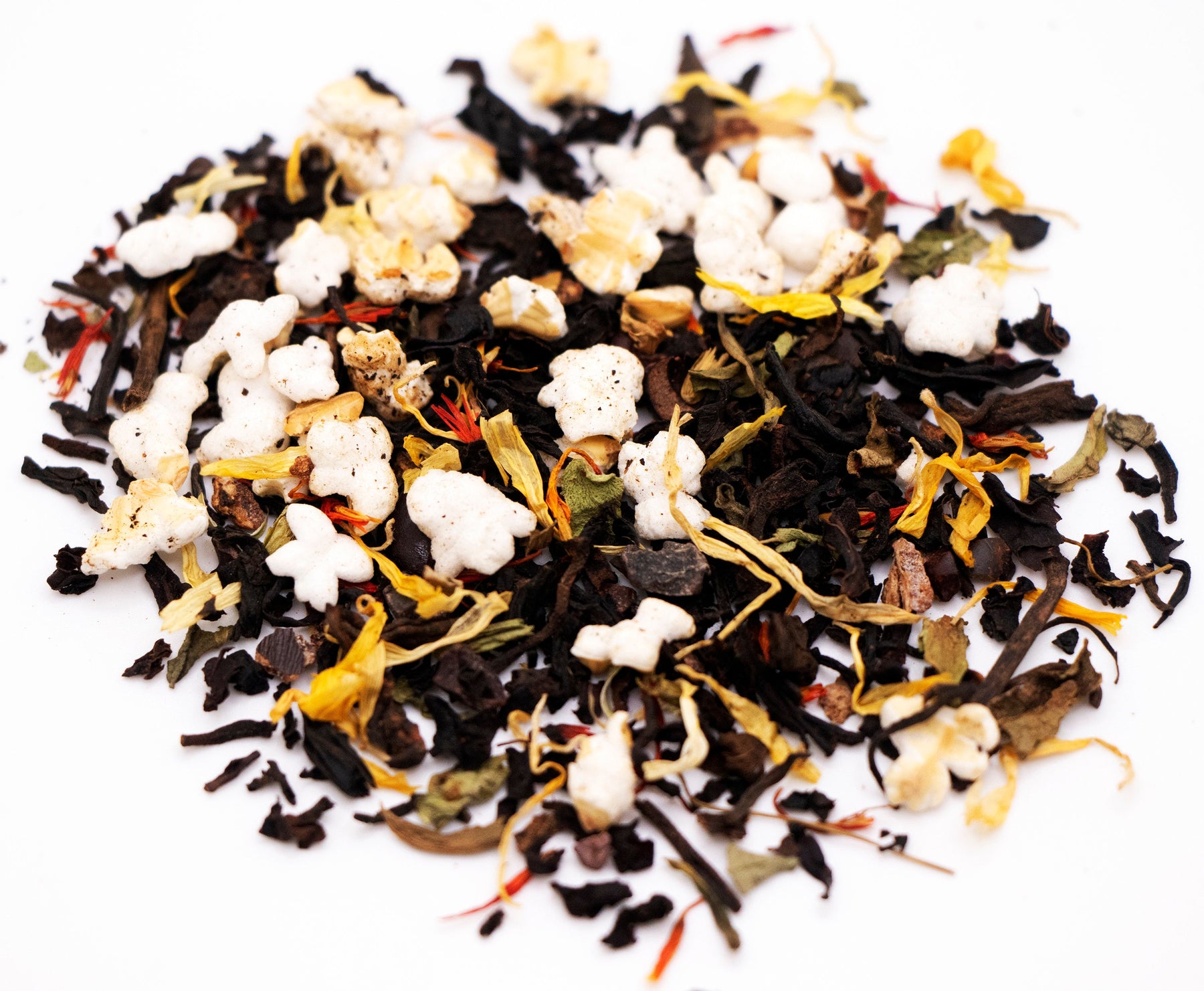 Ingredients: Black Tea, Puerh Tea, Carob Pieces, Cocoa Pieces, Popped Rice, Stevia Leaves, Calendula Petals, Safflower Petals, Natural Flavor (organic compliant).