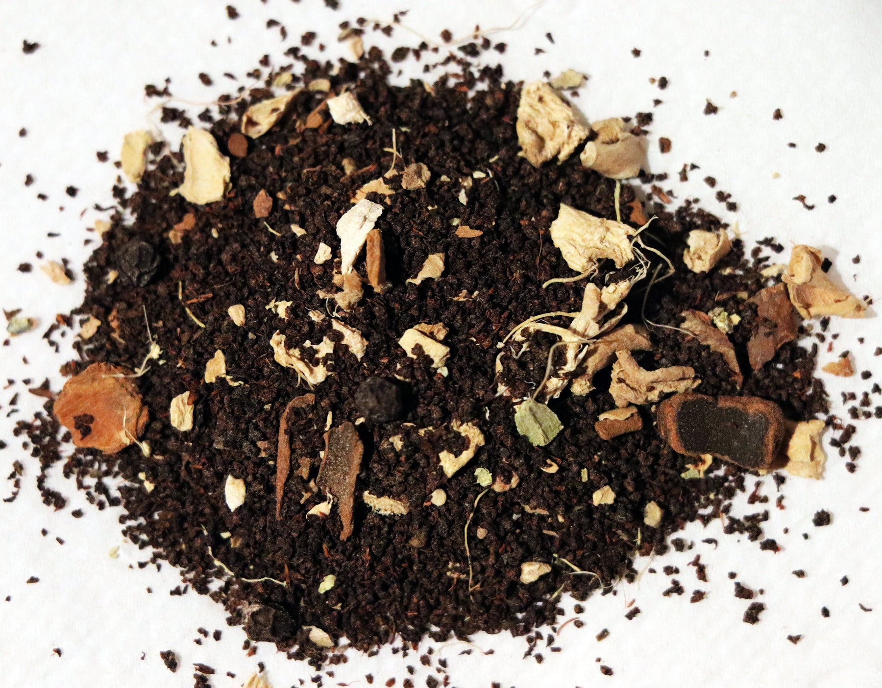 Ingredients: Decaf Black Tea, Ginger Pieces, Cinnamon Pieces, Cardamom Pieces, Black Pepper, White Pepper, Clove Pieces, and Nutmeg