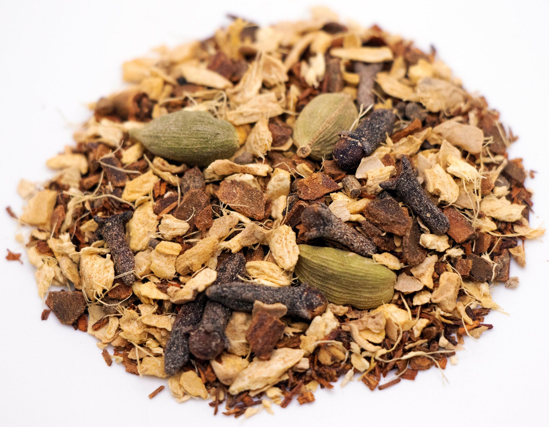 Ingredients: Organic Ginger Root, Organic Cinnamon Bark, Organic Rooibos Tea, Organic Cardamom Pods, Organic Cloves, and Organic Nutmeg