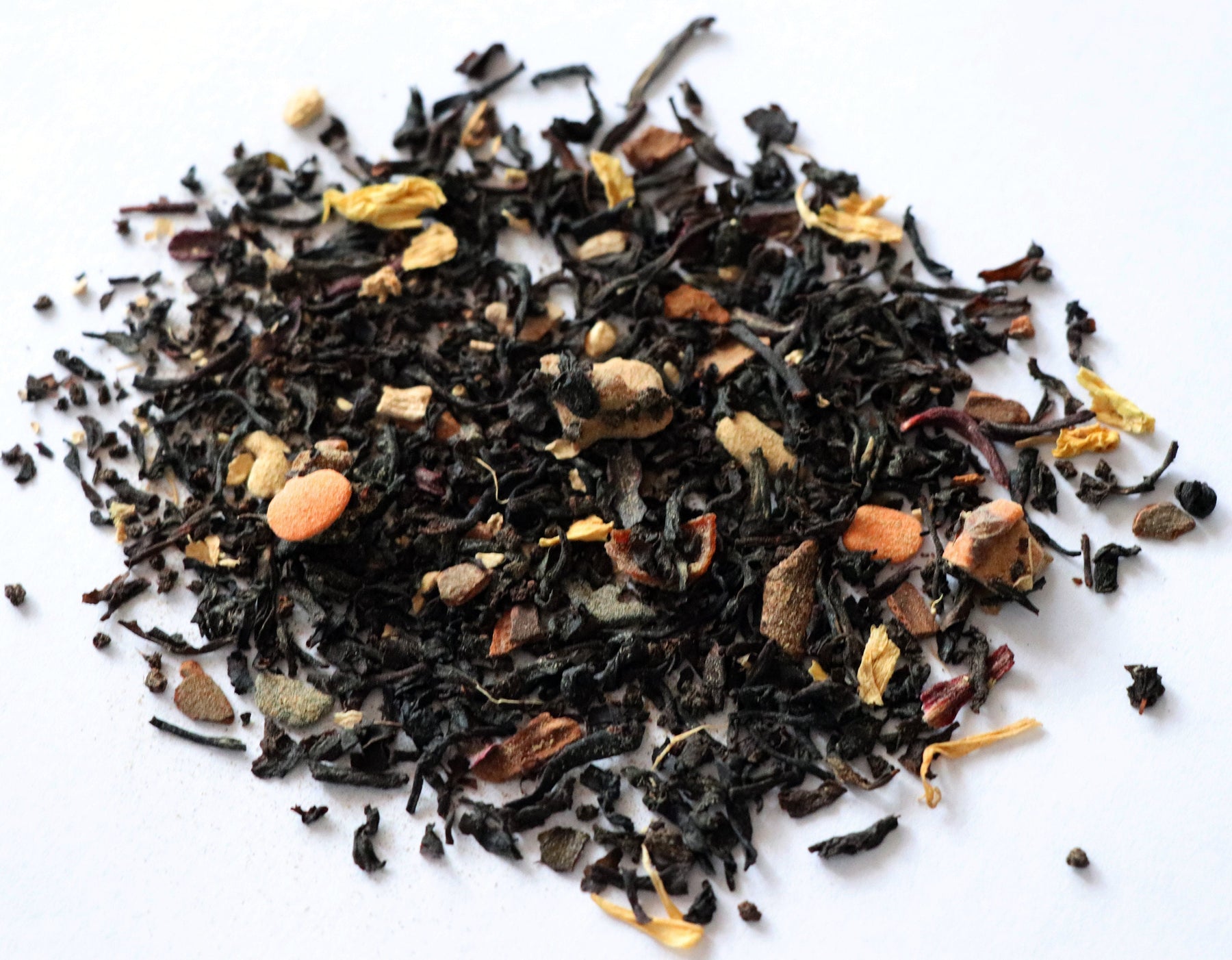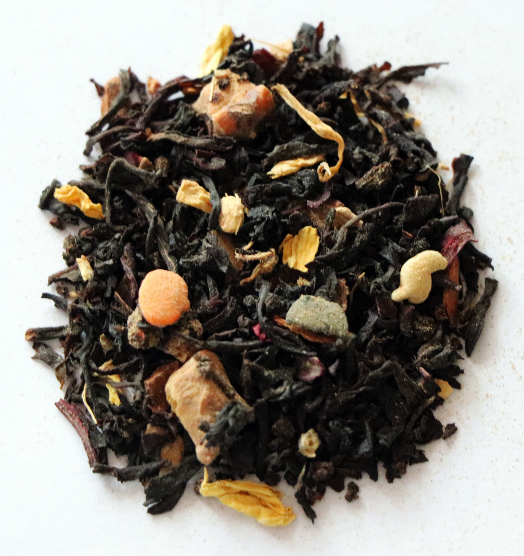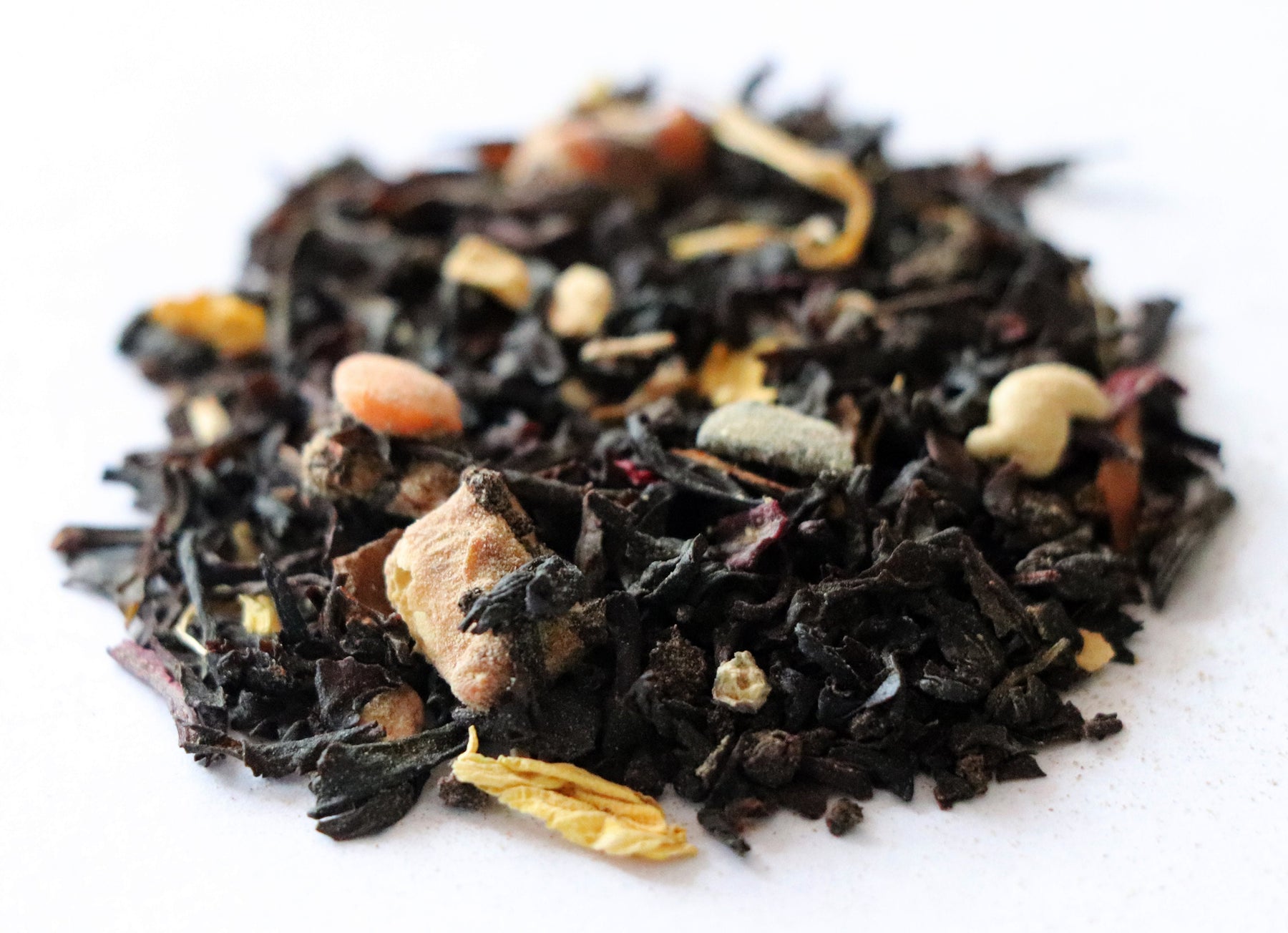 INGREDIENTS: Black Tea, Ginger Pieces, Cinnamon Pieces, Cardamom, Black and White Pepper, Clove, Nutmeg, Hibiscus Petals, Apple Pieces, Rosehip, Candy*, Calendula Petals, Sunflower Petals, Pumpkin Pieces, Natural Flavors (organic complaint) (*Candy: Sugar, Rice Flour, Vegetable Oil, Corn Starch, Confectioner Glaze, Arabic and Cellulose Gum, Carrageenan, Soy Lecithin, Yellow 5 + 6, Blue 1, Red 40) **Allergen Alert - Contains Soy**
