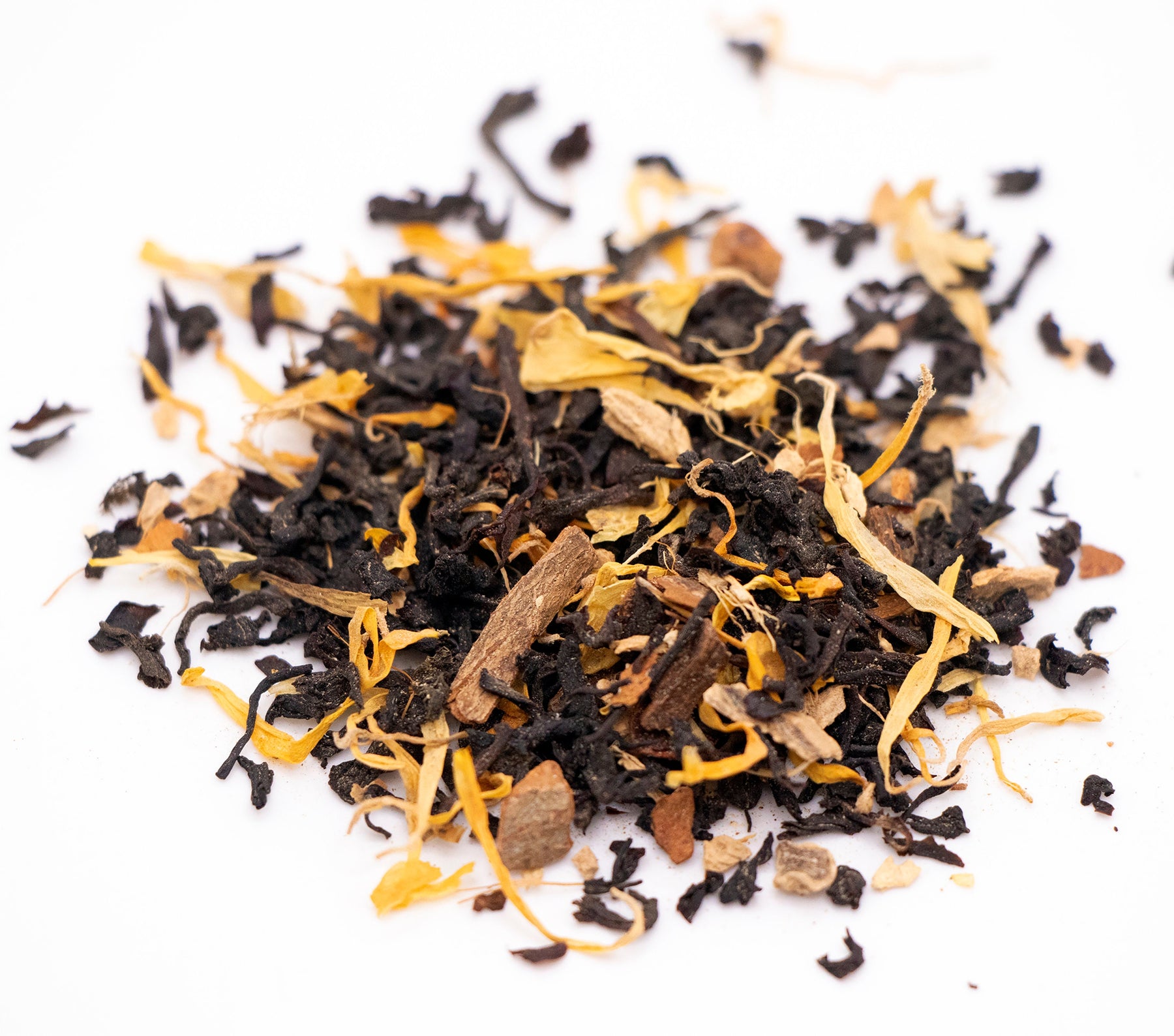 Ingredients: Black Tea, Ginger Pieces, Cinnamon Pieces, Cardamom, Black Pepper, White Pepper, Clove, Calendula Petals, Nutmeg, and Natural Vanilla Flavor