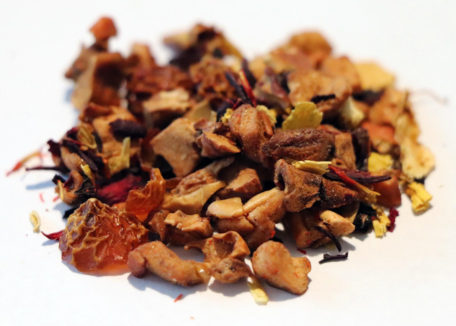 Ingredients: Apple Pieces, Beet Pieces, Hibiscus Petals, Cinnamon Pieces, Pineapple Pieces, Papaya Pieces, Coconut Pieces, Almond Slivers, Popped Rice, Cornflower Petals, Natural Flavoring