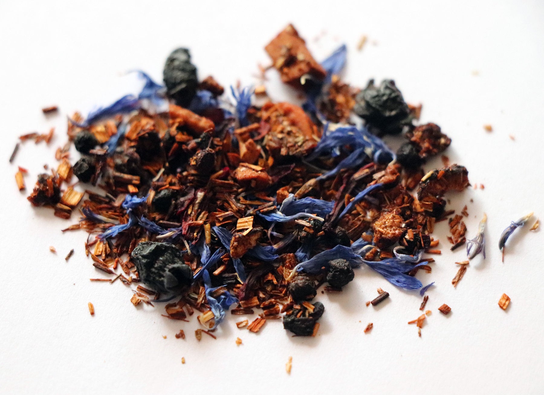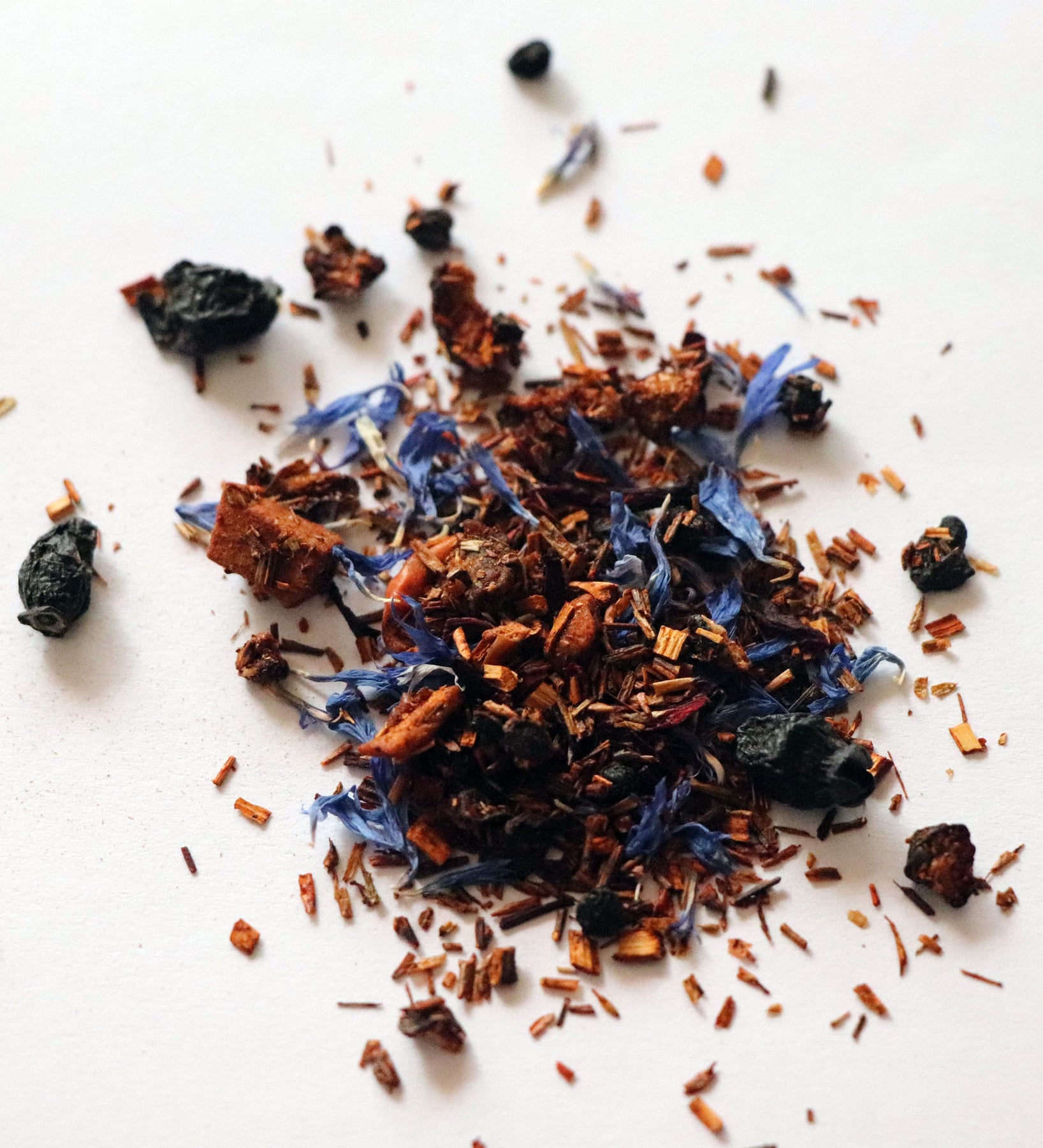 INGREDIENTS: Rooibos, Hibiscus, Apple pieces, Elderberries, Currants (a.k.a. Corinthian raisins), American Blueberries, European Blueberries (a.k.a. bilberries), Cornflower petals, Natural flavors