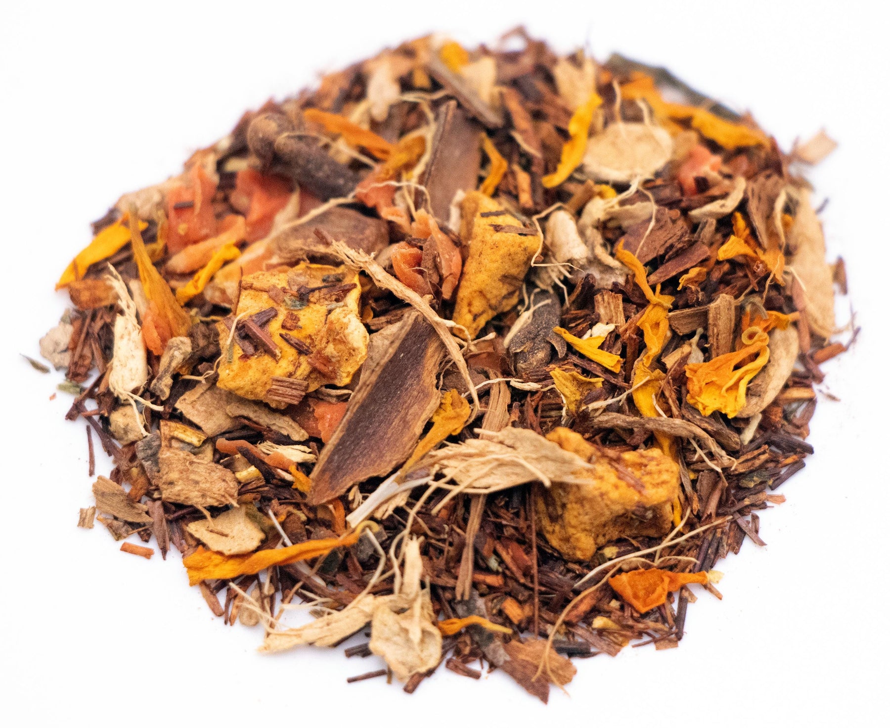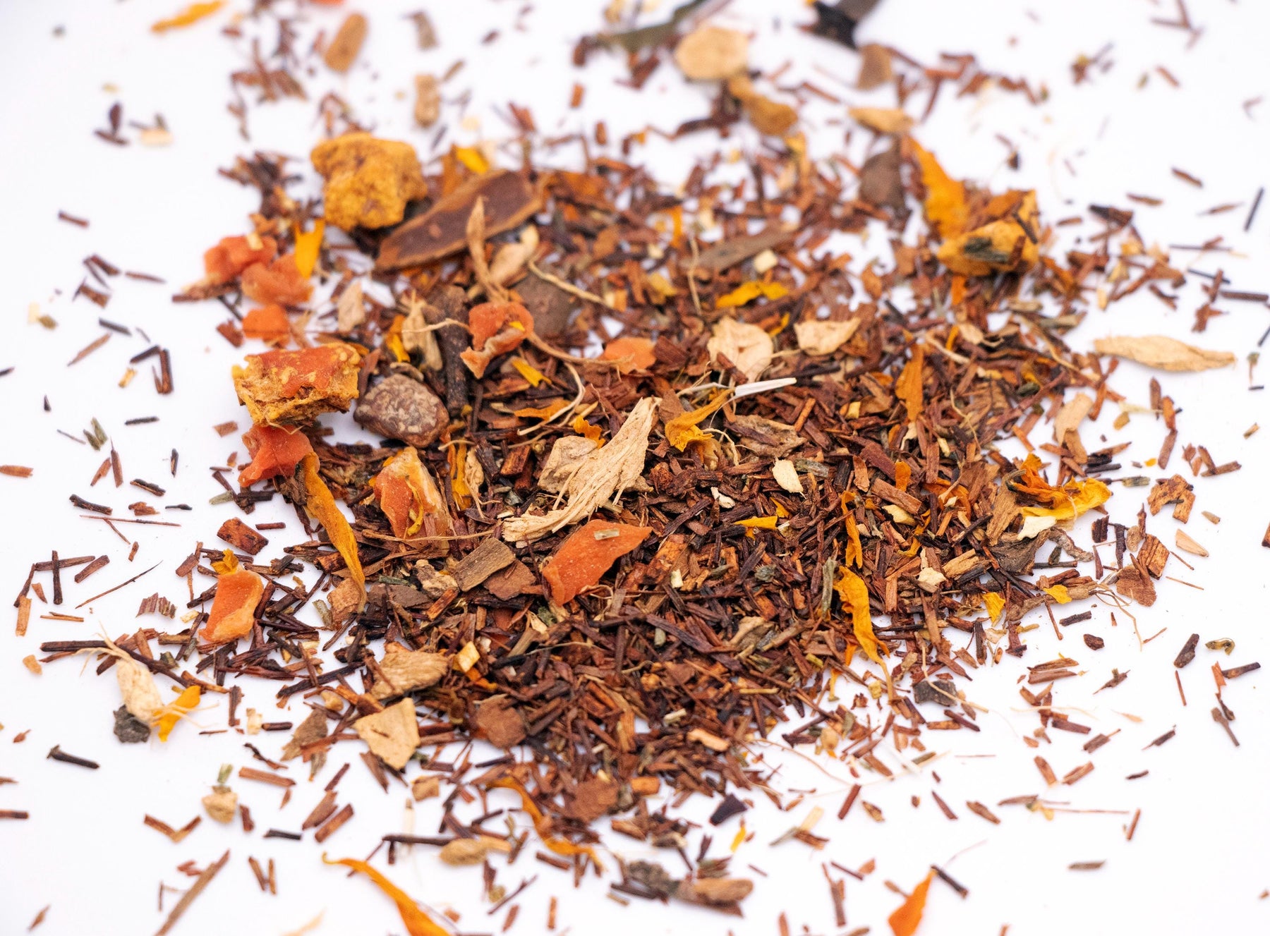 Ingredients: Red Rooibos, Green Rooibos, Ginger Pieces, Cinnamon Pieces, Carrot Pieces, Clove Pieces, Marigold Petals, Nutmeg Pieces, Pumpkin Pieces, Natural Pumpkin Flavoring