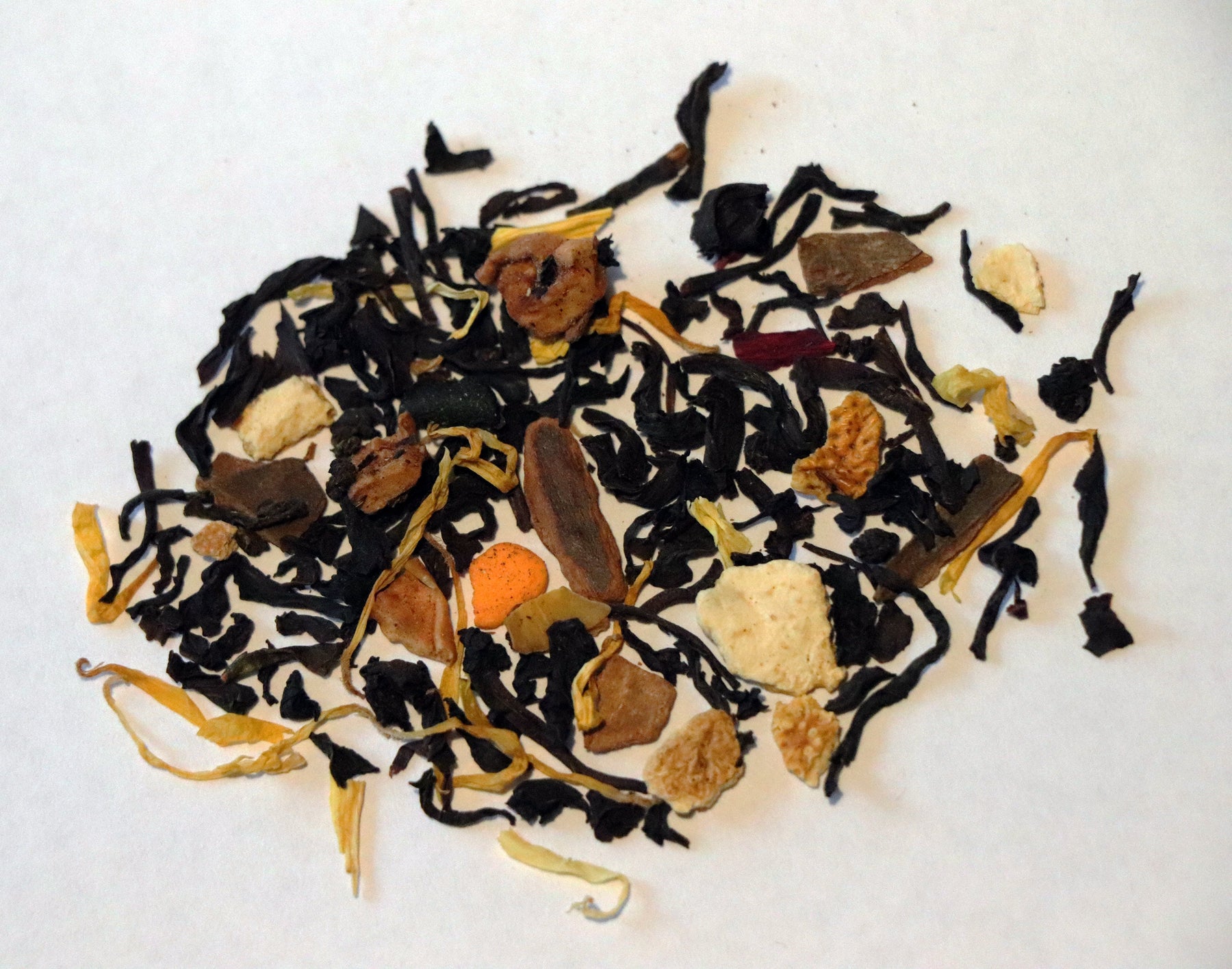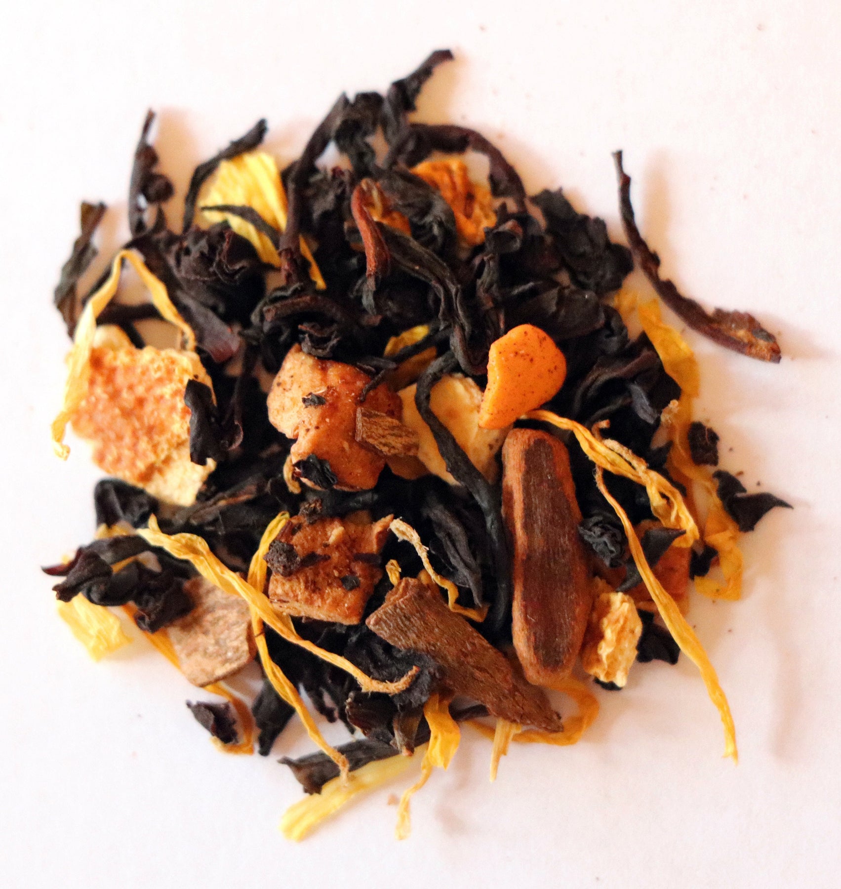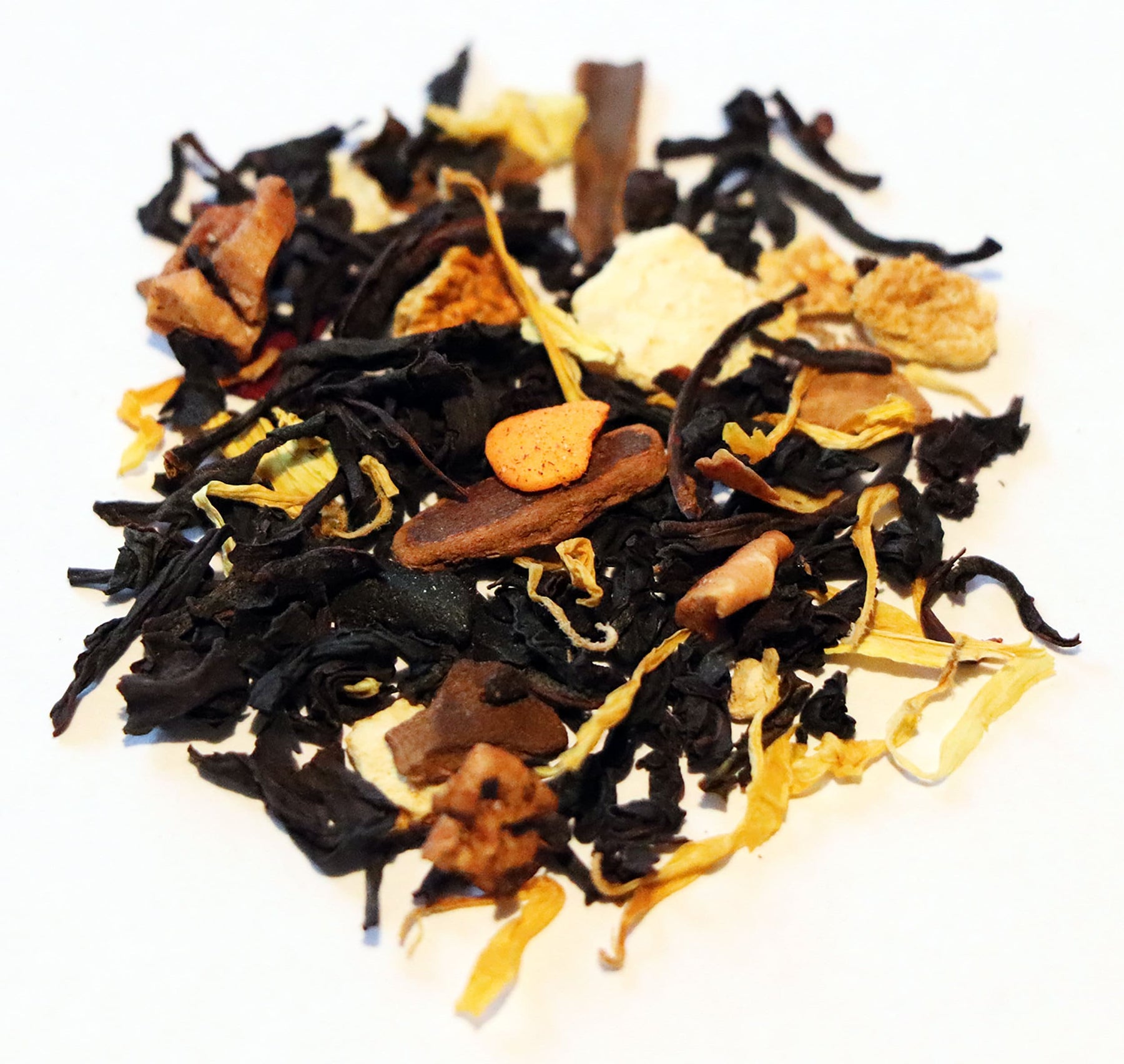 INGREDIENTS: Black tea, Rooibos, Candy*, Apple + Orange + Rosehip + Almond + Vanilla Pieces, Hibiscus + Calendula + Sunflower Petals, Cinnamon, Natural Flavors (organic compliant) (*Candy: Sugar, Corn starch, Vegetable oil, Rice Flour, Soy Lecithin, Dextrin, Confectioner glaze, Arabic + Cellulose gum, Carnauba wax, Blue1, Carrageenan, Yellow 5 + 6, Red 40 + 3 dye)