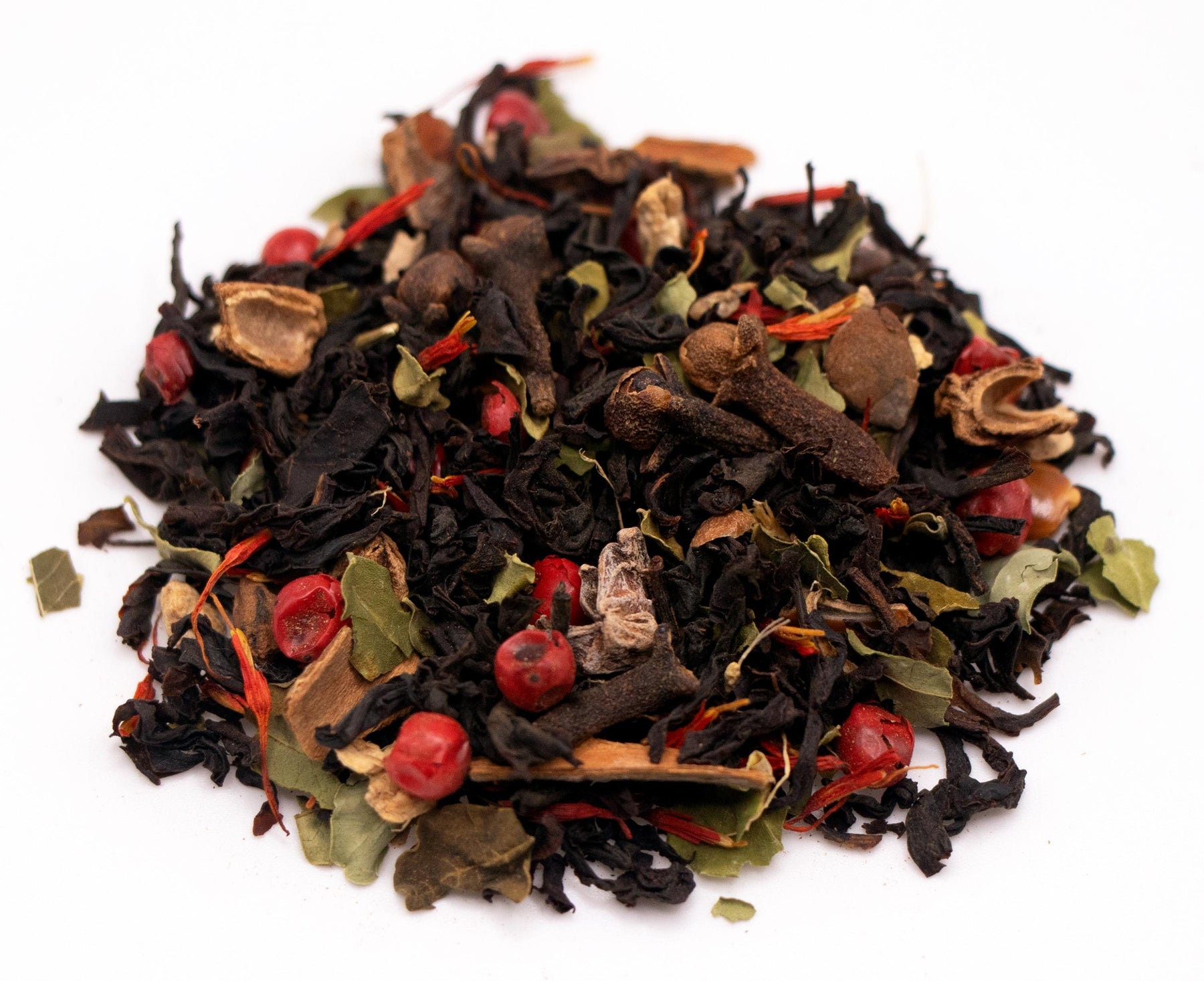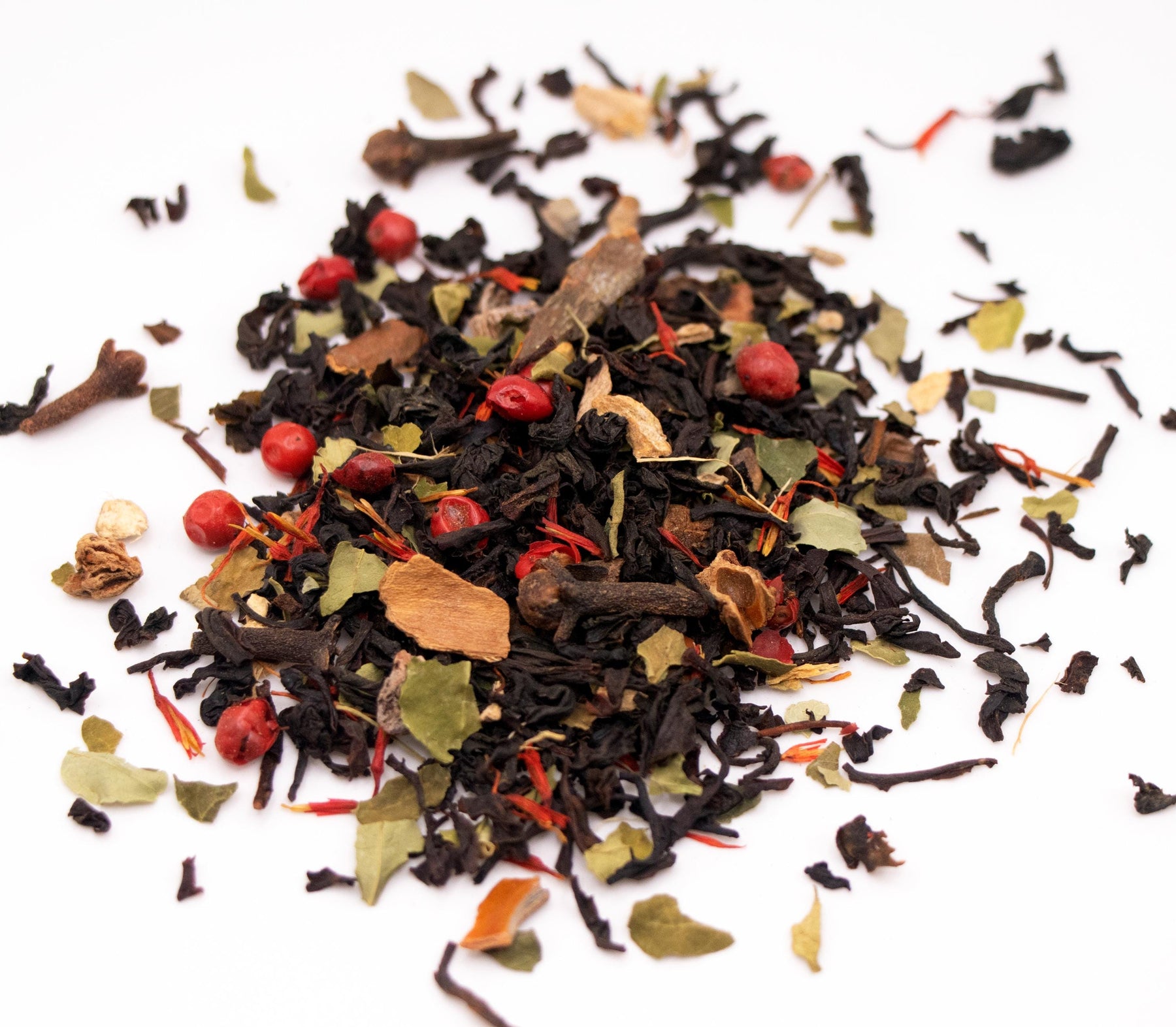 Ingredients: Black Tea, Cinnamon Pieces, Cherry Pieces, Ginger Pieces, Star Anise, Clove Pieces, Moringa Leaves, Pink Peppercorns, Safflower Petal, Natural Cherry Flavor