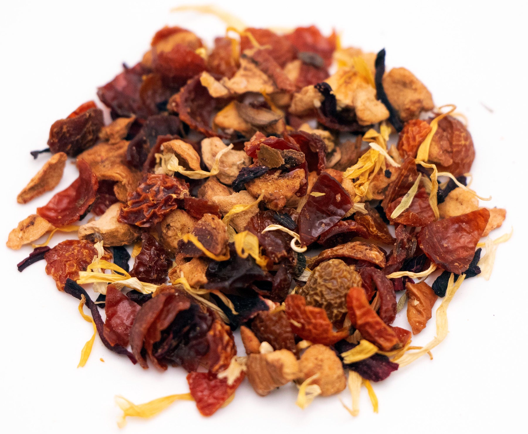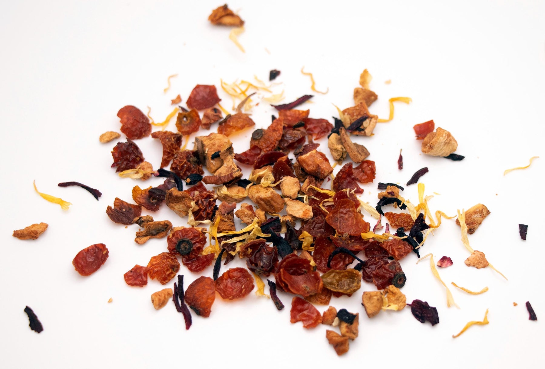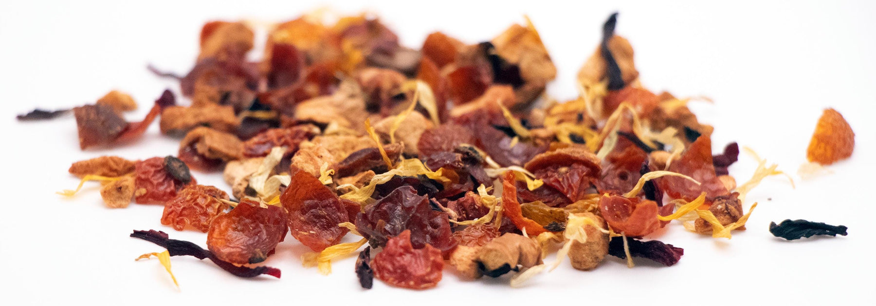 Ingredients: Apple Pieces, Rosehip Pieces, Hibiscus Petals, Orange Pieces, Maple Syrup, Calendula Petals, Natural Maple Flavor. *Organic Certified Organic by Pro-Cert Organic Systems (Organic Equivalency with COR, NOP, EU, JAS)