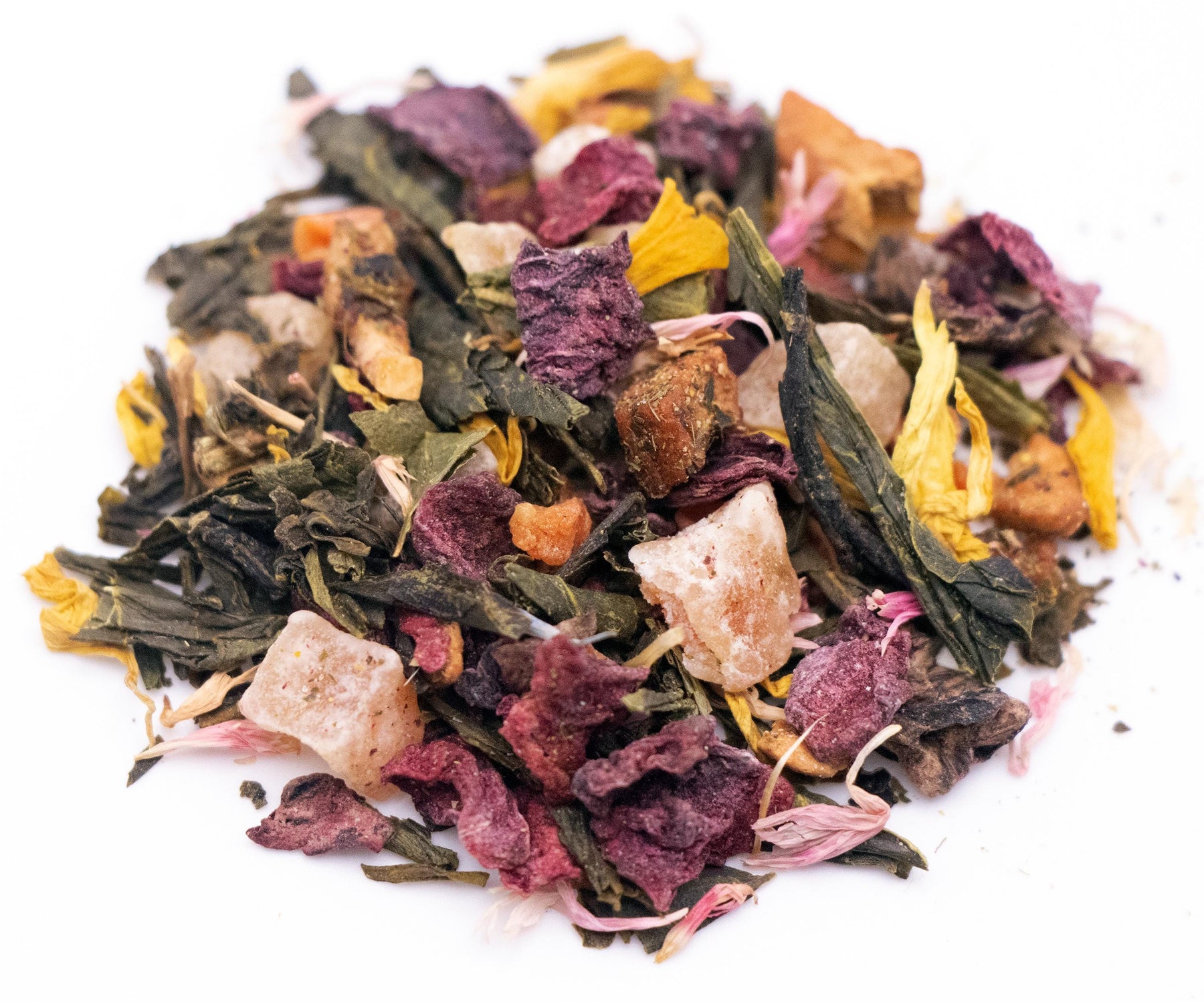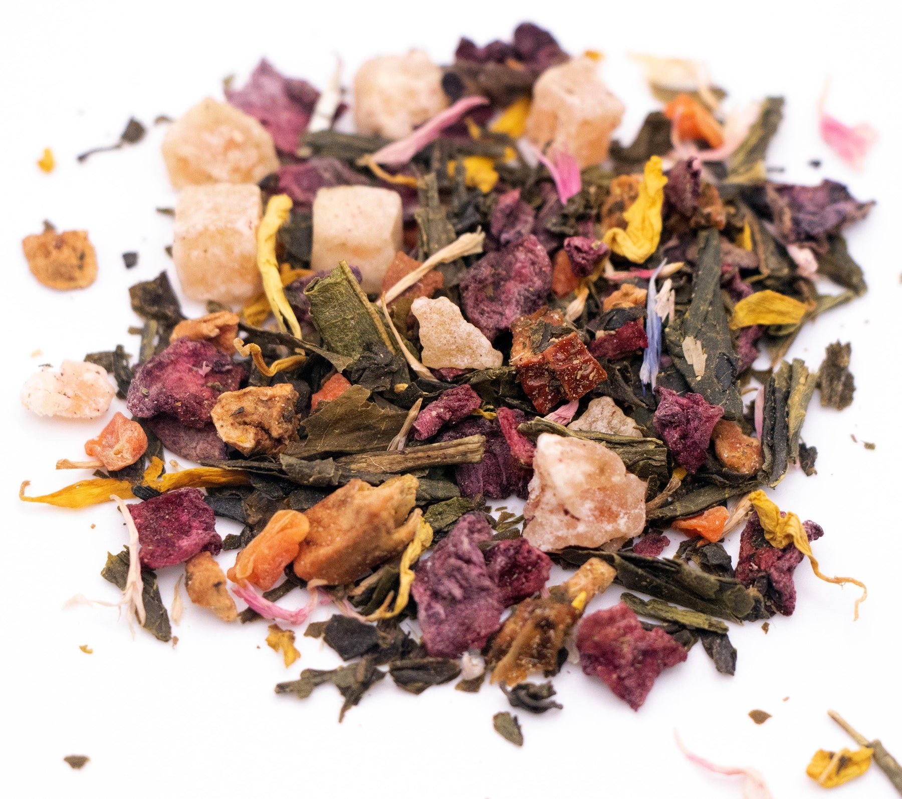 Ingredients: Green Tea, Beet Root Pieces, Pineapple Pieces, Apple Pieces, Papaya Pieces, Carrot Pieces, Mango Pieces, Pink Cornflower Petals, Marigold Petals, Natural Fruit Flavors.