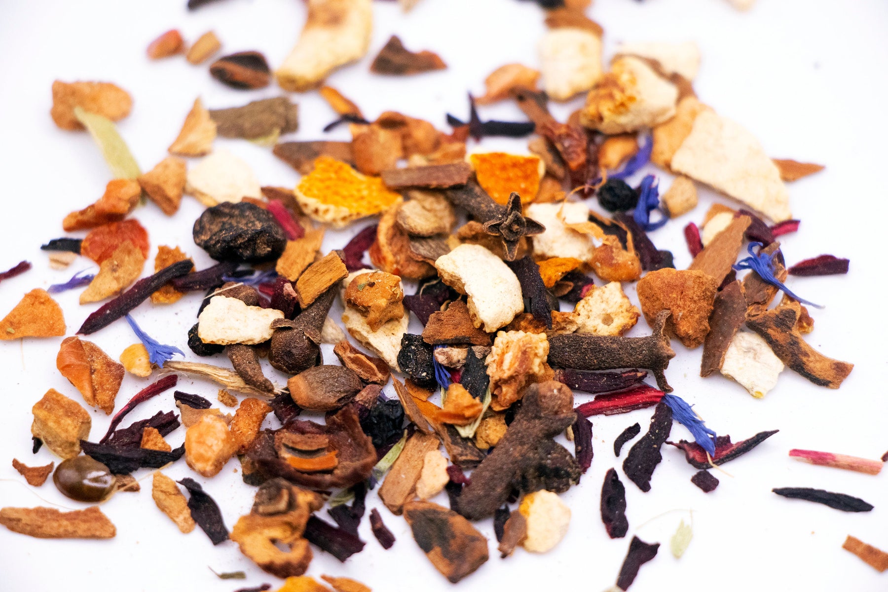 INGREDIENTS: Apple Pieces, Hibiscus Petals, Cinnamon Pieces, Star Anise, Orange Peel, Cloves, Elderberries, Currants, Cardamom, Rosehip Petals, Ginger, Stevia, Cornflower Petals, Black Pepper, Natural flavors (organic compliant).