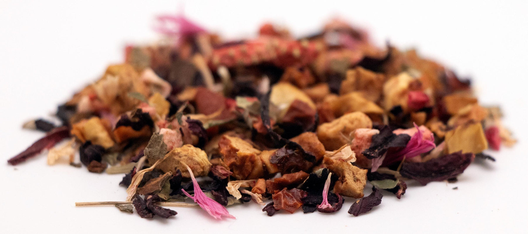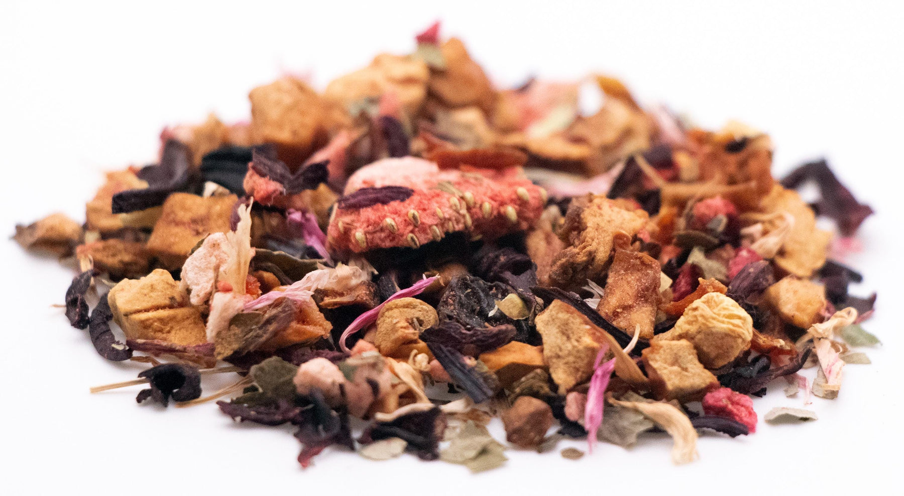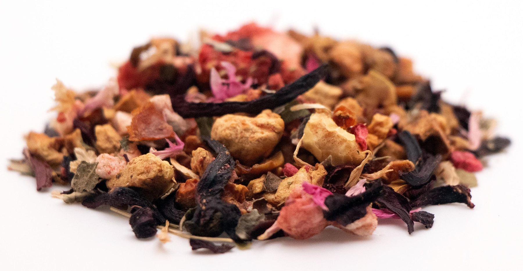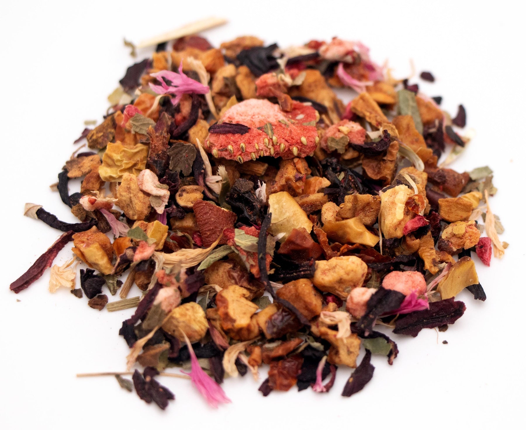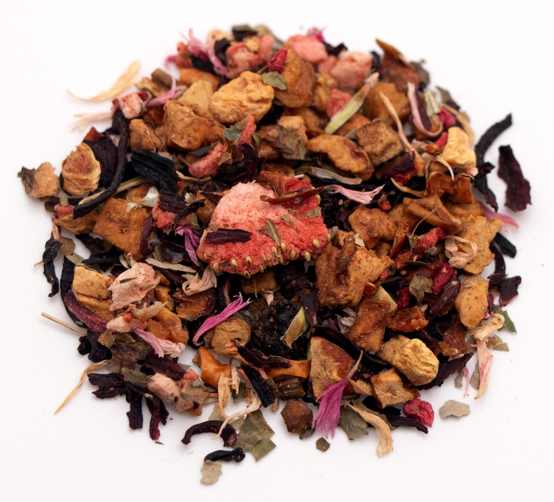 Ingredients: Apple Pieces, Hibiscus Petals, Rosehip Pieces, Currant Pieces, Blackberry Leaves, Turkey Rhubarb Root Pieces, Strawberry Leaves, Strawberry Pieces, Raspberry Pieces, Cornflower Petals, Natural Strawberry Flavor.