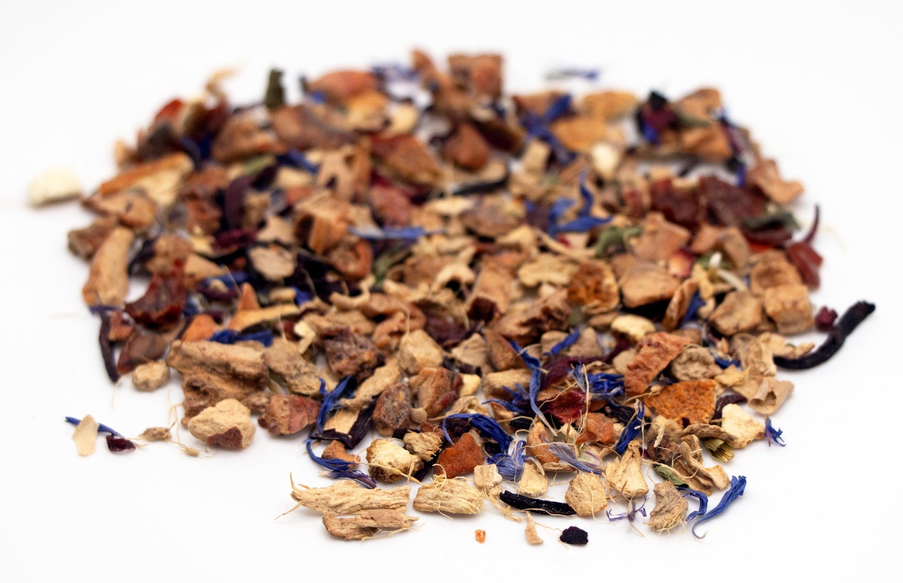Ingredients: Apple Pieces, Ginger Pieces, Orange Pieces, Hibiscus Petals, Bael Nut Pieces, Rosehip Pieces, Stevia Leaves, Cornflower Petals