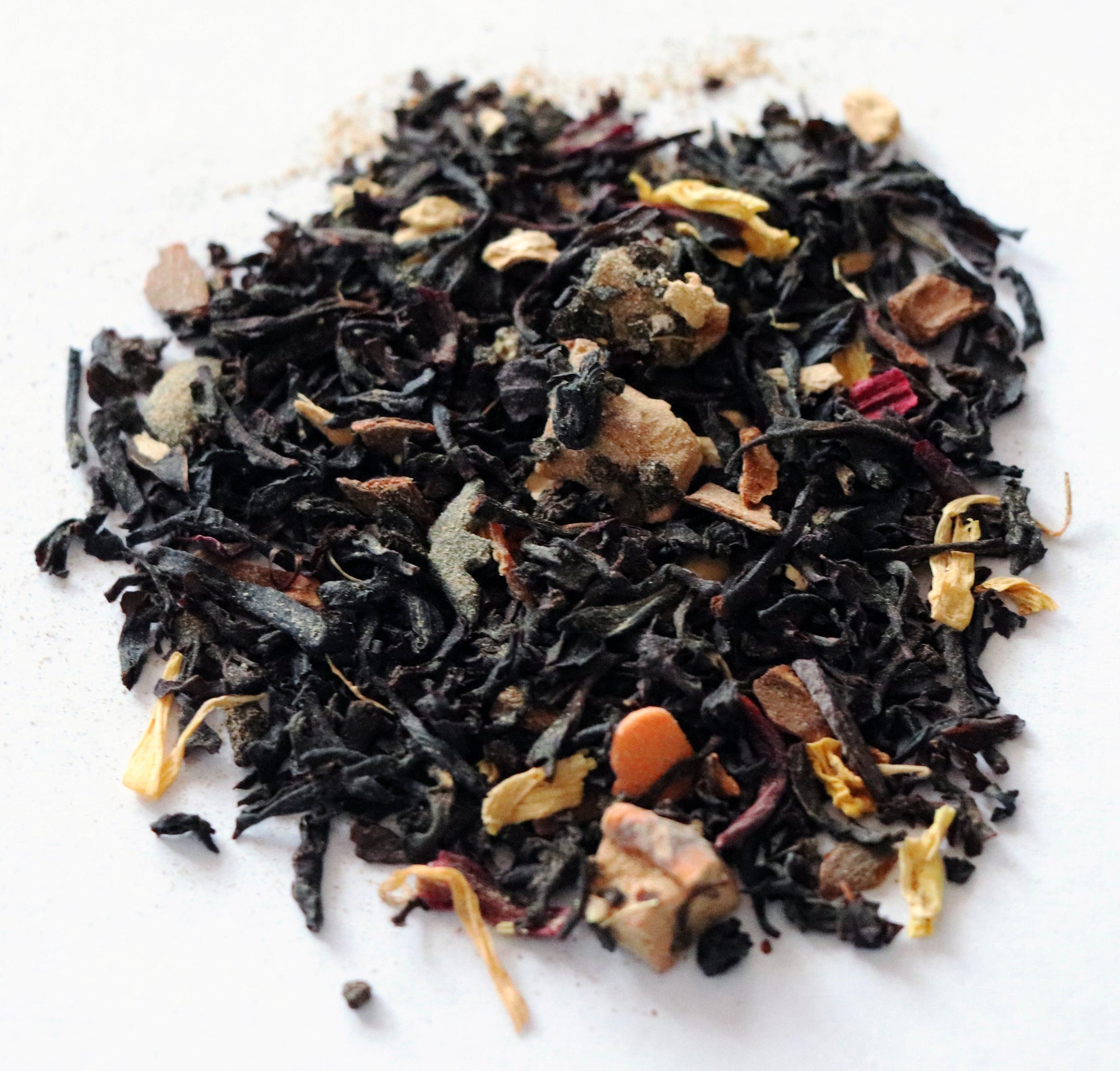 INGREDIENTS: Black Tea, Ginger Pieces, Cinnamon Pieces, Cardamom, Black and White Pepper, Clove, Nutmeg, Hibiscus Petals, Apple Pieces, Rosehip, Candy*, Calendula Petals, Sunflower Petals, Pumpkin Pieces, Natural Flavors (organic complaint) (*Candy: Sugar, Rice Flour, Vegetable Oil, Corn Starch, Confectioner Glaze, Arabic and Cellulose Gum, Carrageenan, Soy Lecithin, Yellow 5 + 6, Blue 1, Red 40) **Allergen Alert - Contains Soy**