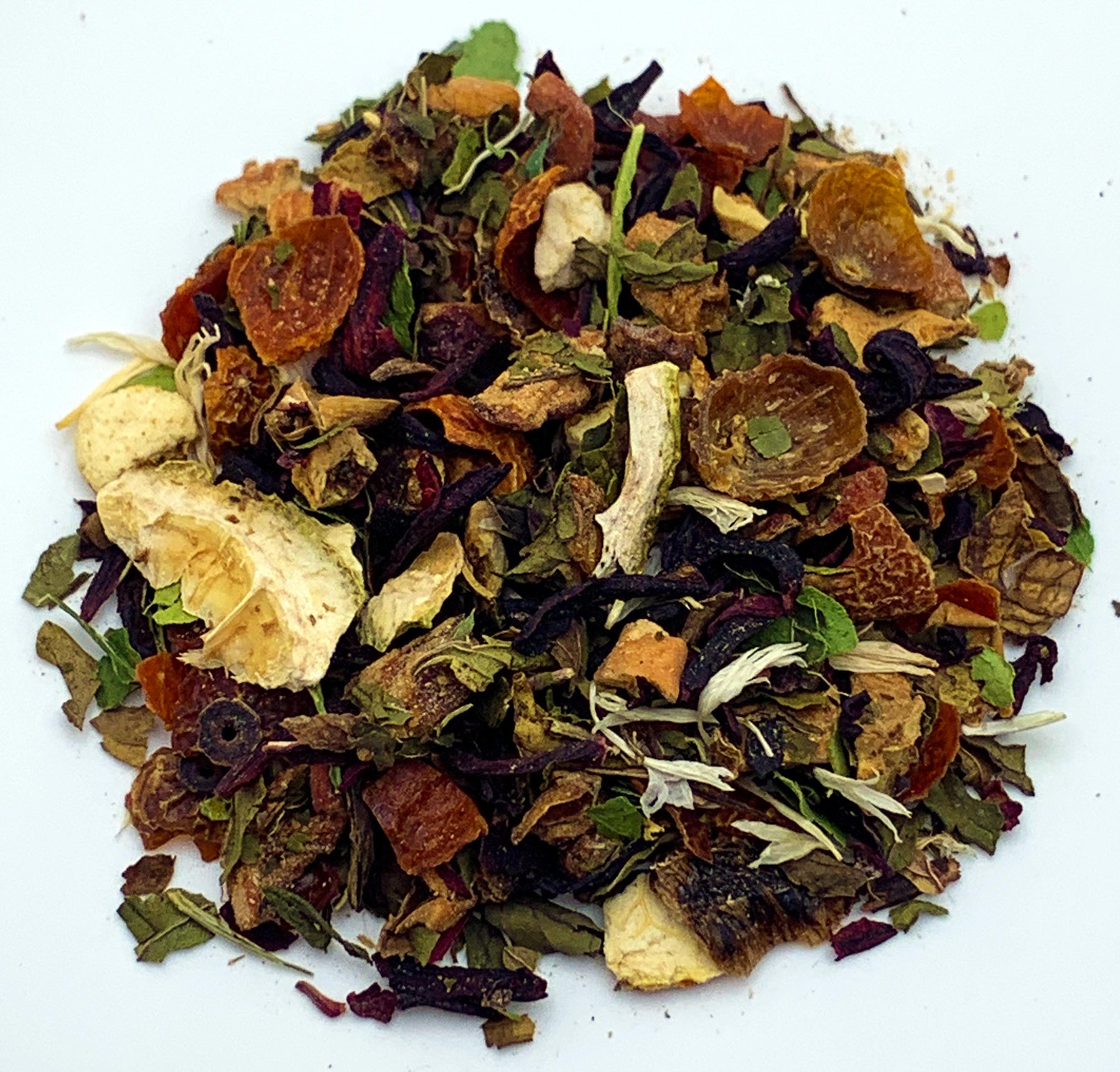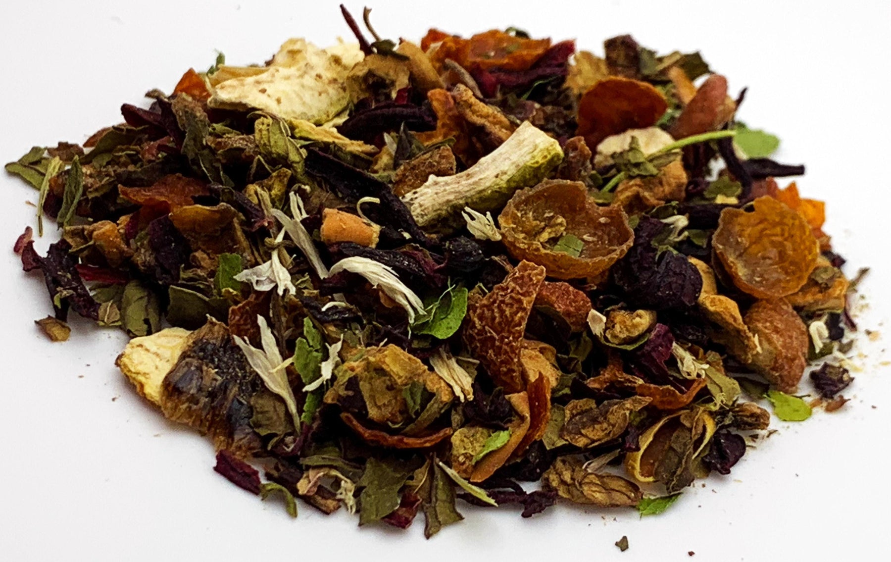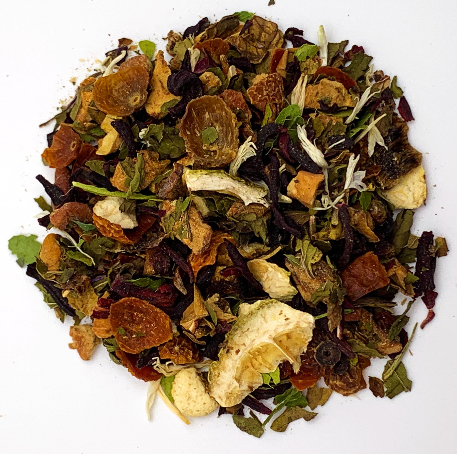 Ingredients: Hibiscus Petals, Apple Pieces, Peppermint Leaves, Rosehip Pieces, Orange Pieces, Lime Pieces, Lemon Pieces, Lime Leaves, Spearmint Leaves, Cornflower Petals