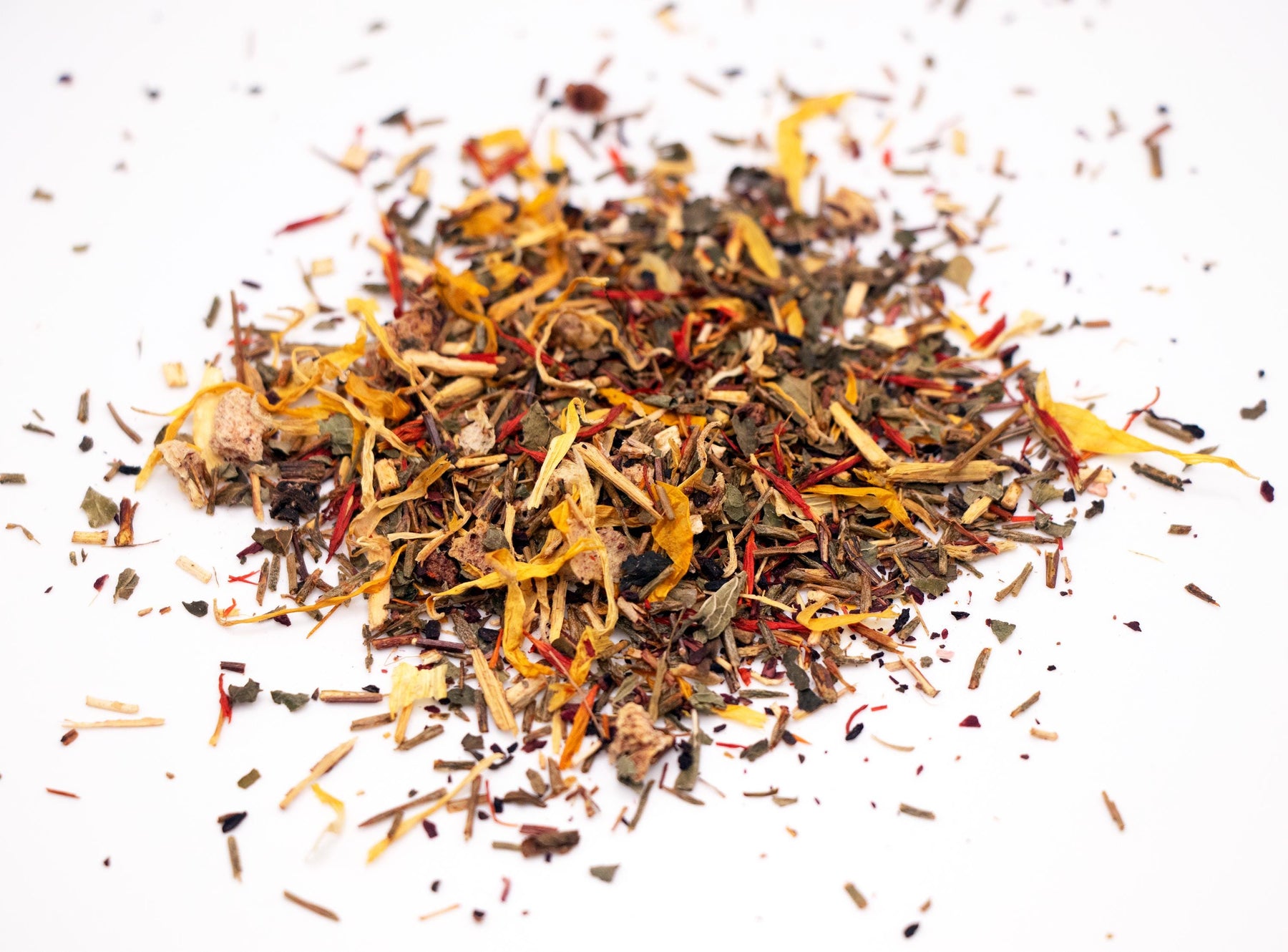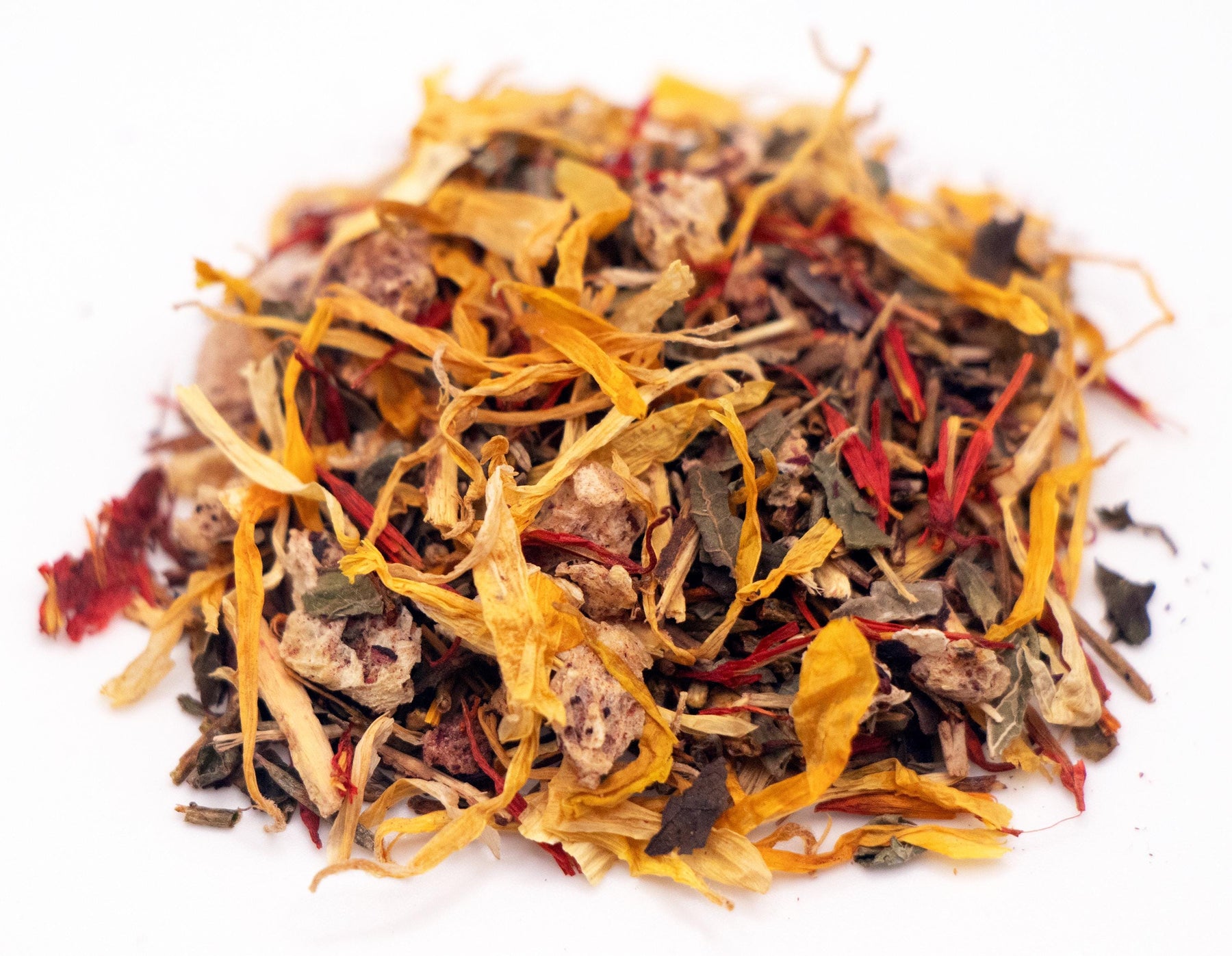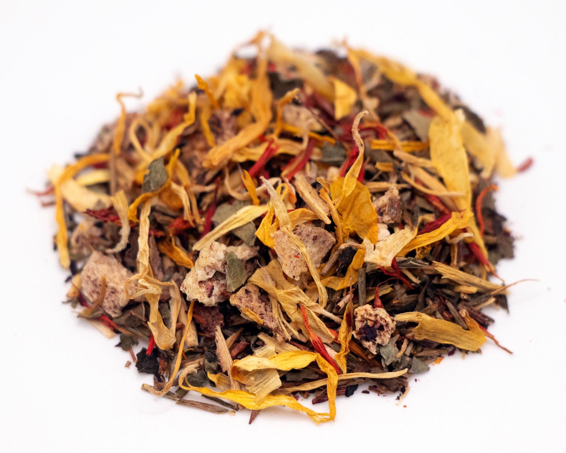 Ingredients: Green Rooibos Leaves, Hibiscus Petals, Licorice Root Pieces, Blueberries , Lemon Balm Leaves, Peach Pieces, Safflower Petals, Calendula Petals, Marigold Petals, Natural Peach Flavor