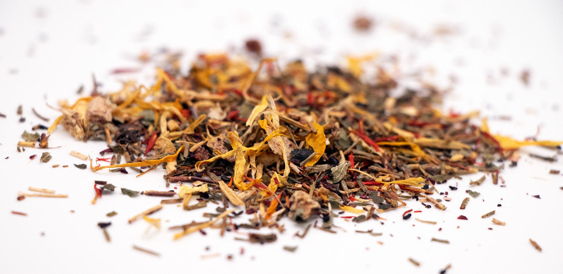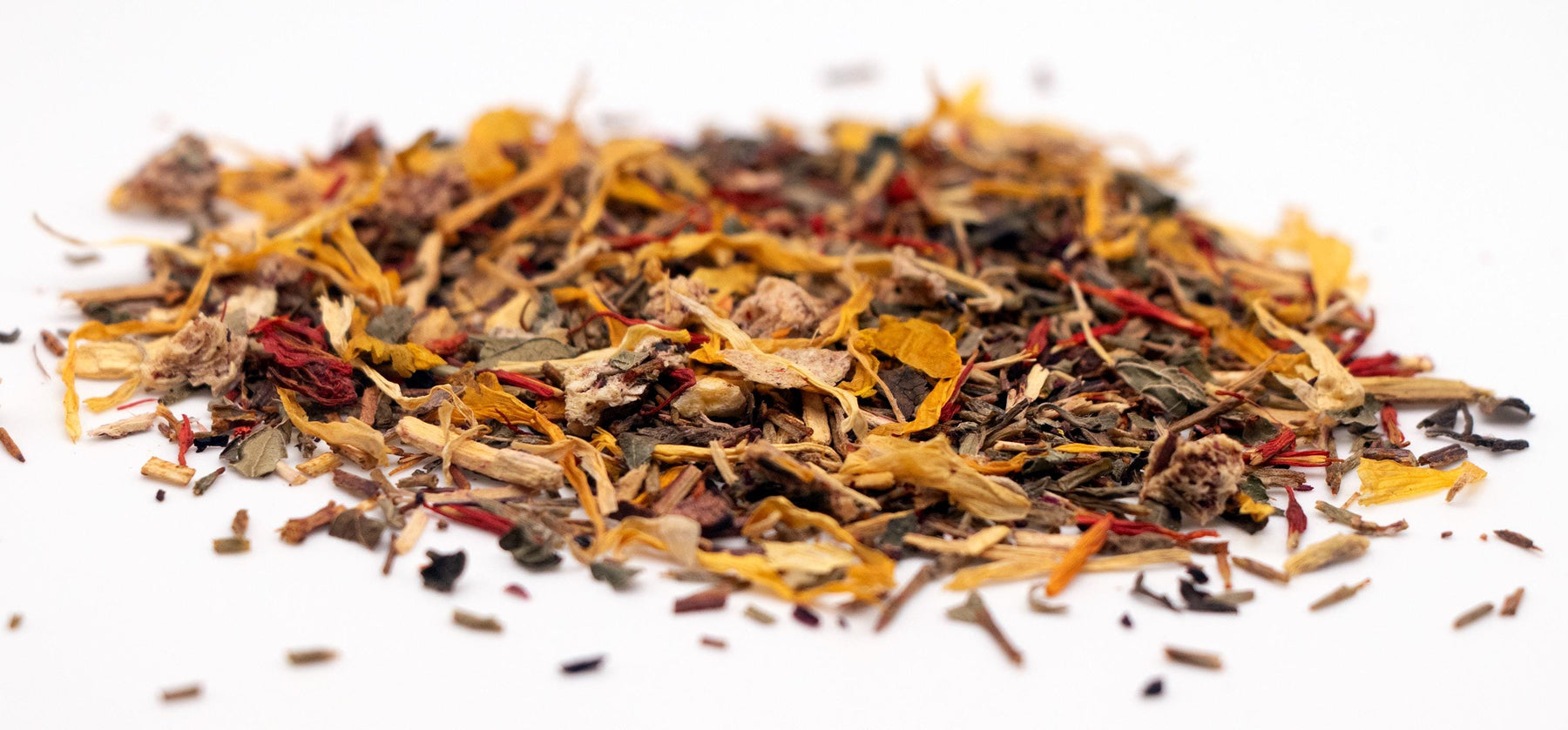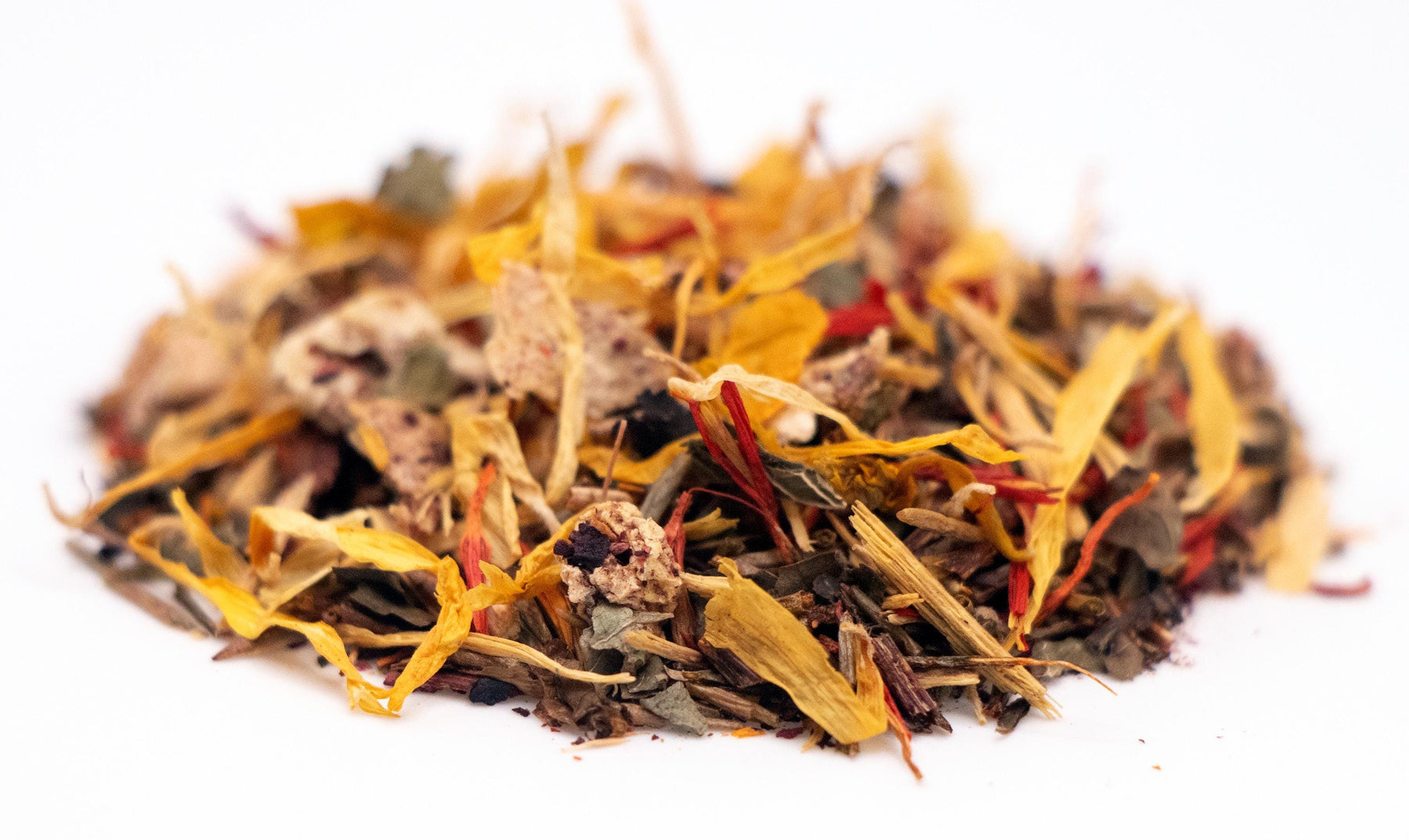 Ingredients: Green Rooibos Leaves, Hibiscus Petals, Licorice Root Pieces, Blueberries , Lemon Balm Leaves, Peach Pieces, Safflower Petals, Calendula Petals, Marigold Petals, Natural Peach Flavor