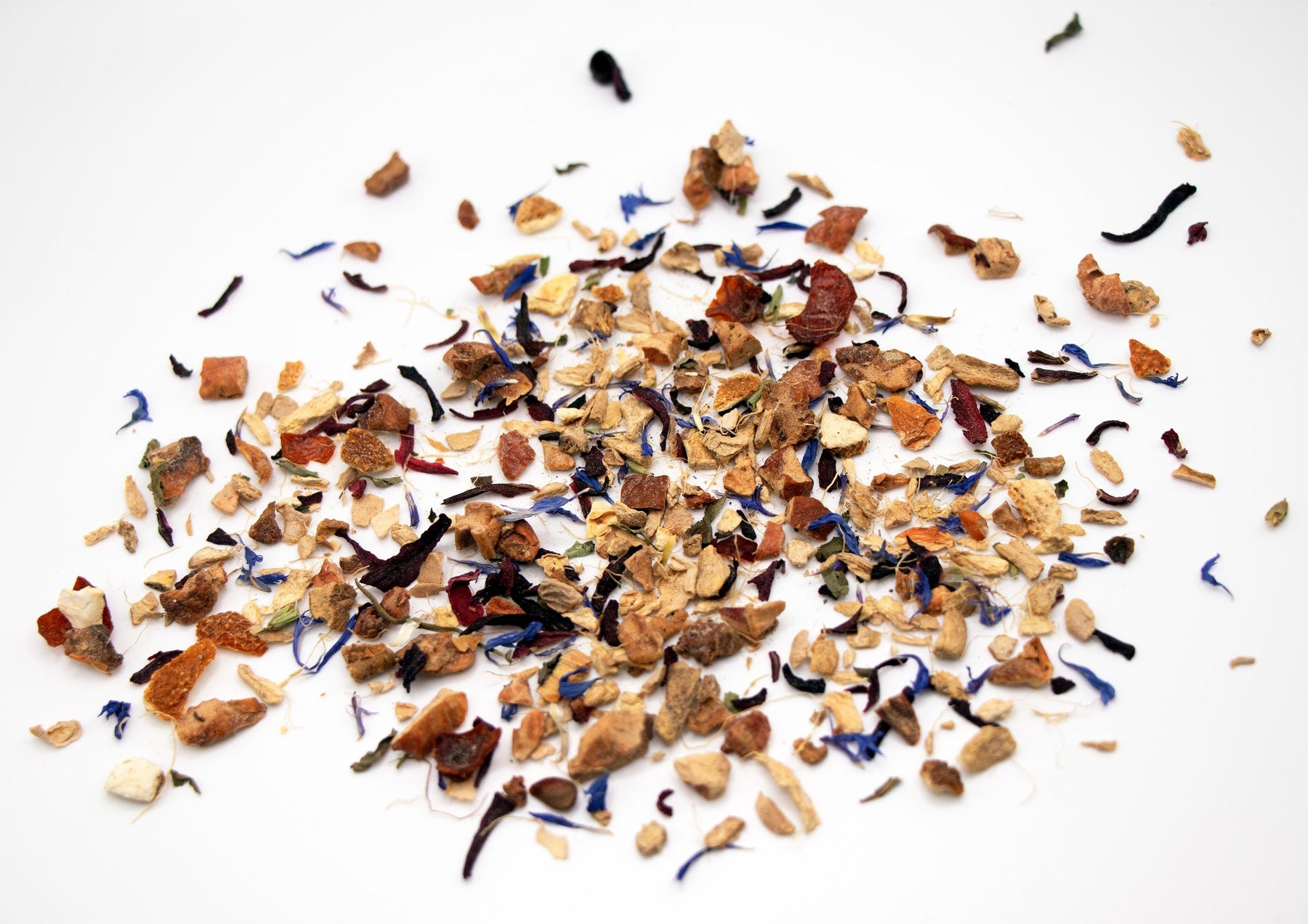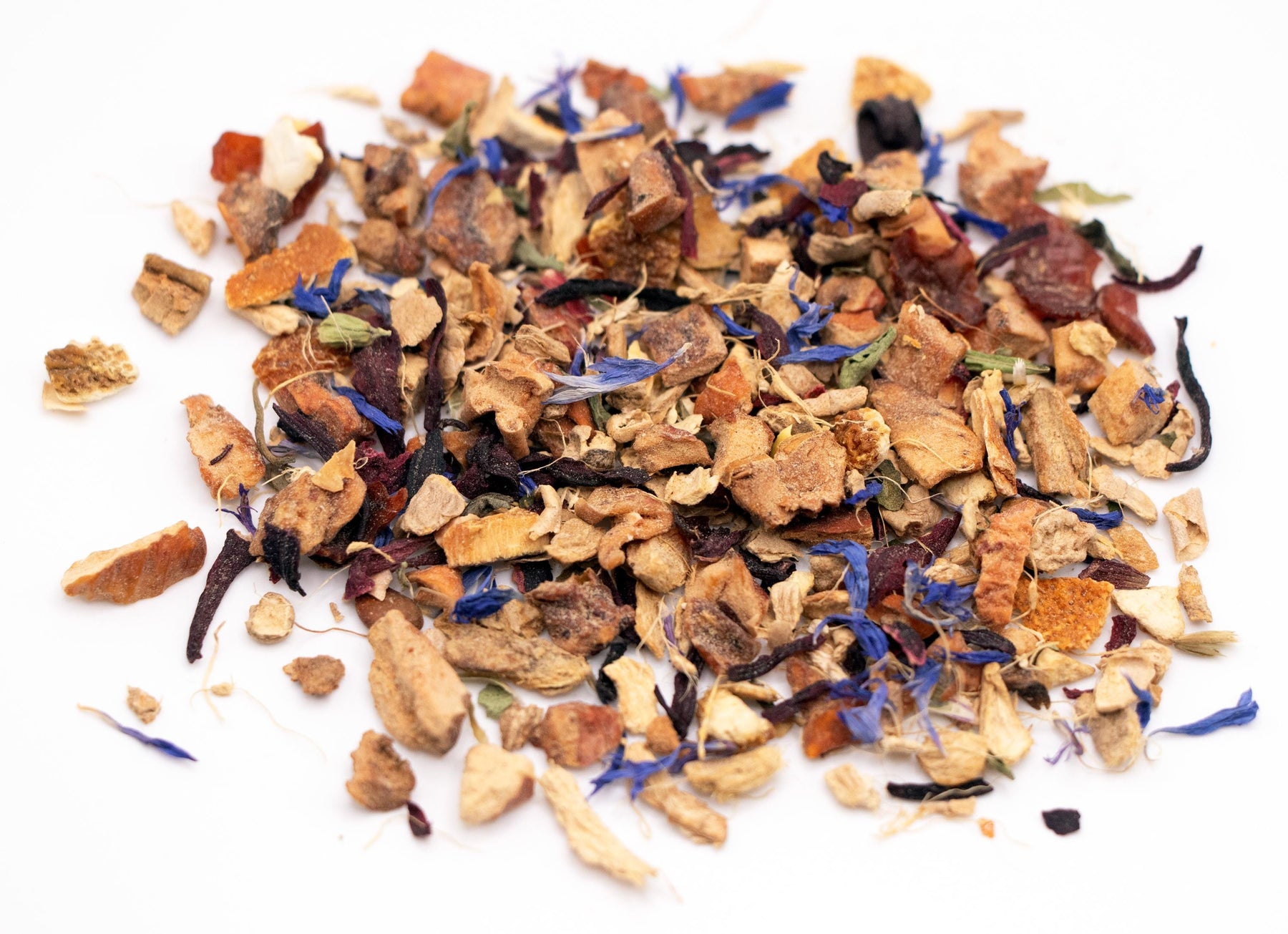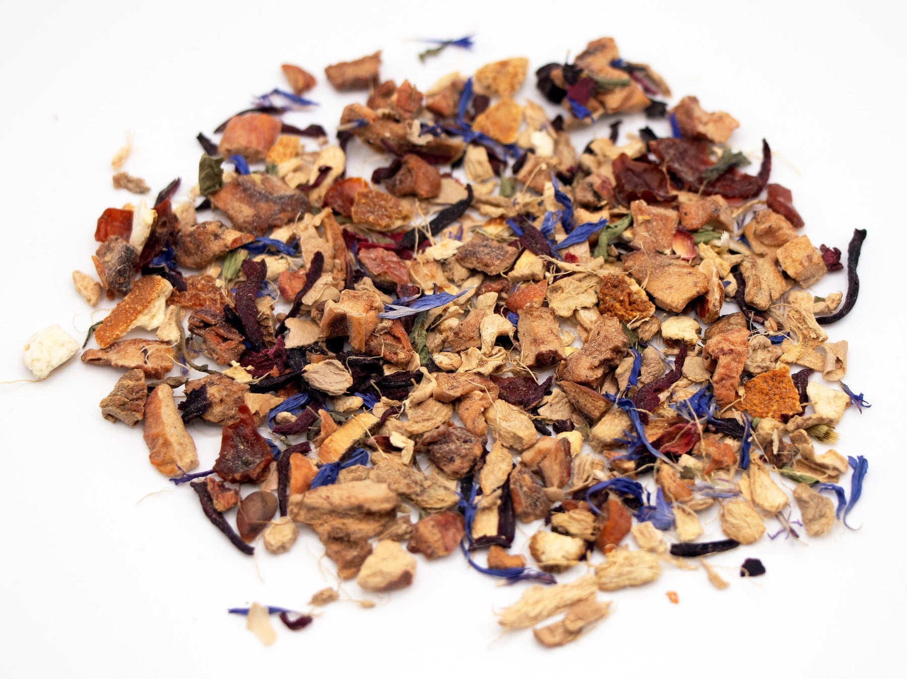 Sweet Crimson Solstice Herbal Tea - A comforting twist of orchard-fresh apple, zesty ginger, and vibrant hibiscus blossoms — naturally sweetened with a kiss of stevia. This caffeine-free herbal blend brews into a ruby-red cup that’s both soothing and spirited, with a gentle warmth that lingers like a cozy fireside glow. Perfect for crisp mornings or unwinding at twilight, it’s a sip of comfort with a spark of cheer.