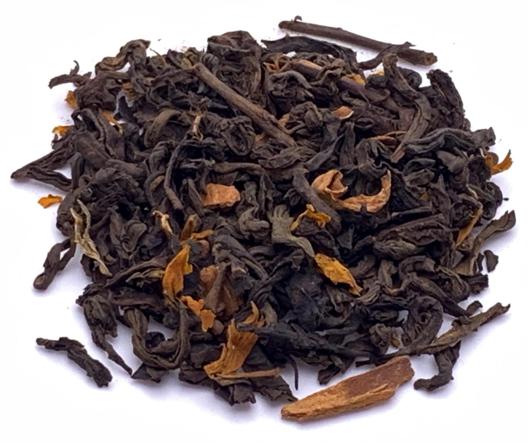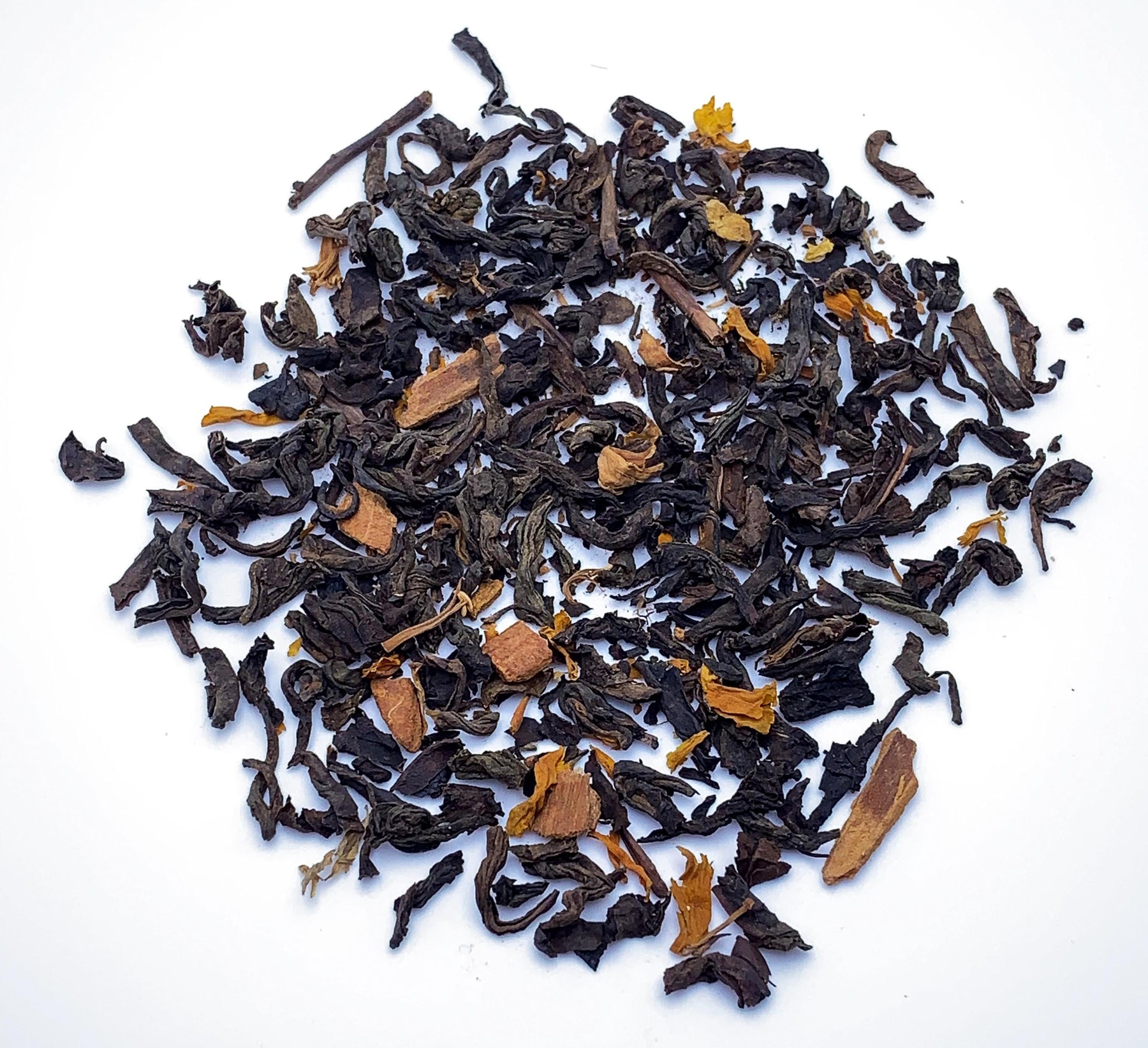 Ingredients: Pu-erh Black Tea, Cinnamon Pieces, Clove Pieces, Orange Blossoms, Cardamom Pieces, Pumpkin, Marigold Petals, Natural Pumpkin Flavor