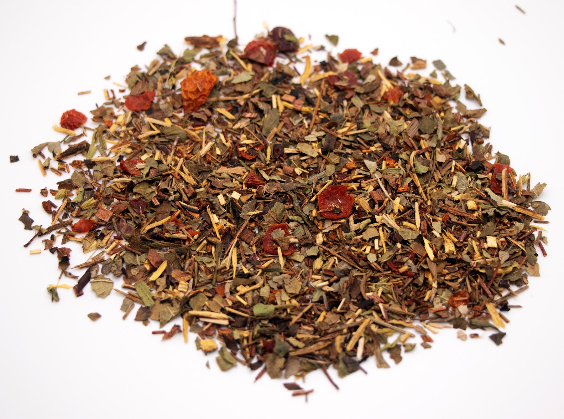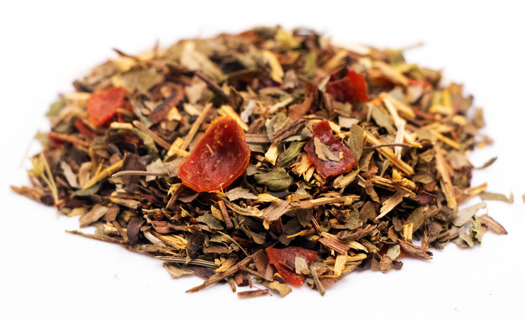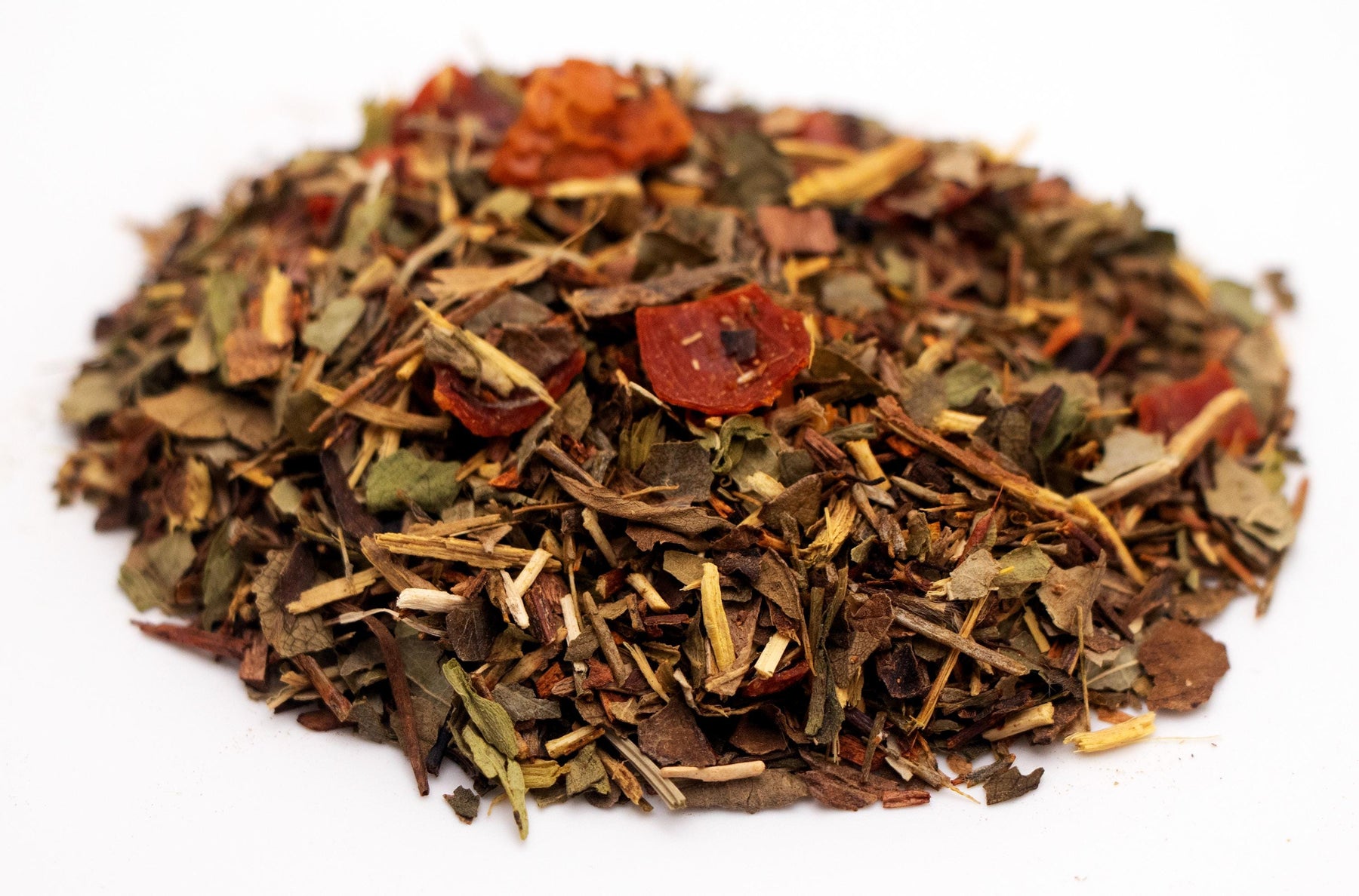Ingredients: Red Rooibos, Green Rooibos, Licorice Root, Strawberry Leaves, Blackberry Leaves, Rosehip Pieces, Honeybush Tea, Sarsaparilla Leaves, Stevia Leaves, Natural Flavors