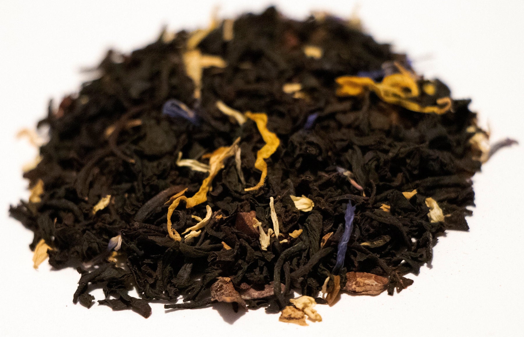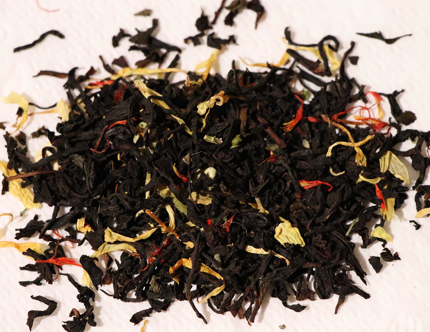 Ingredients: Black Tea, Orange Pieces, Cocoa Pieces, Lemon Balm Leaves, Safflower + Calendula + Sunflower petals, Natural Flavors (Organic Compliant)