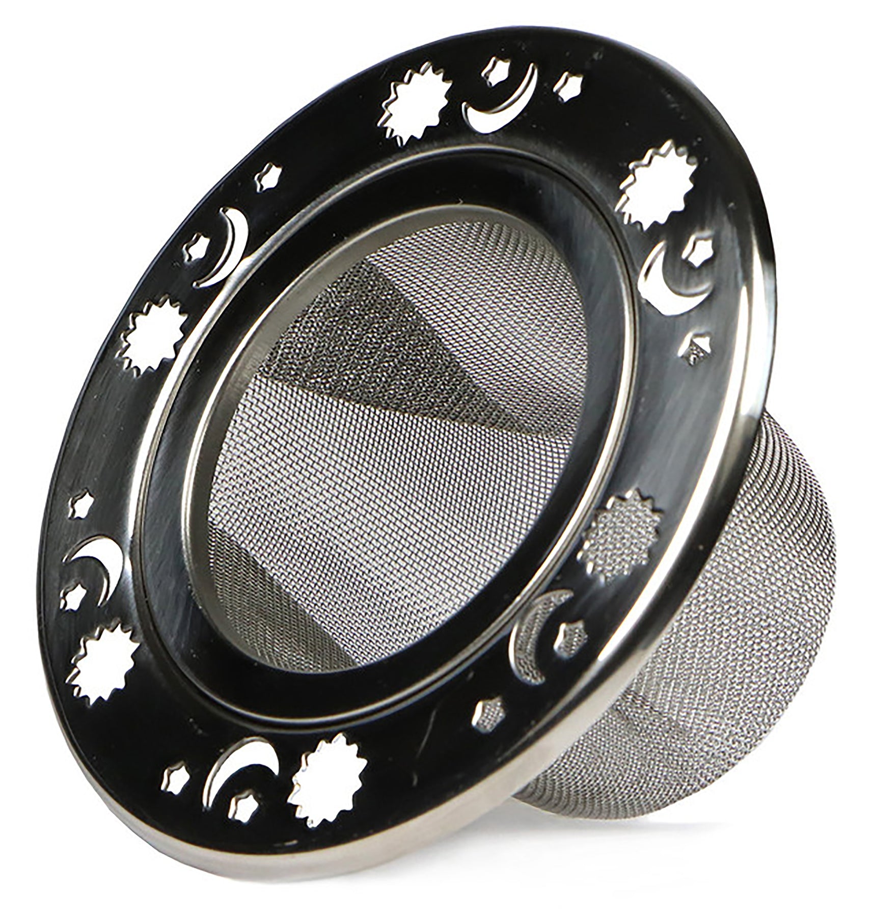 Savor tea in style with this versatile stainless steel tea strainer warmly decorated around the rim in a beautiful celestial motif. Equally suitable for all sizes of mugs, and fits well on small tea pots. Simply place a small amount of material into the steel mesh canister and submerge into a cup of hot water to brew your favorite infusion.
