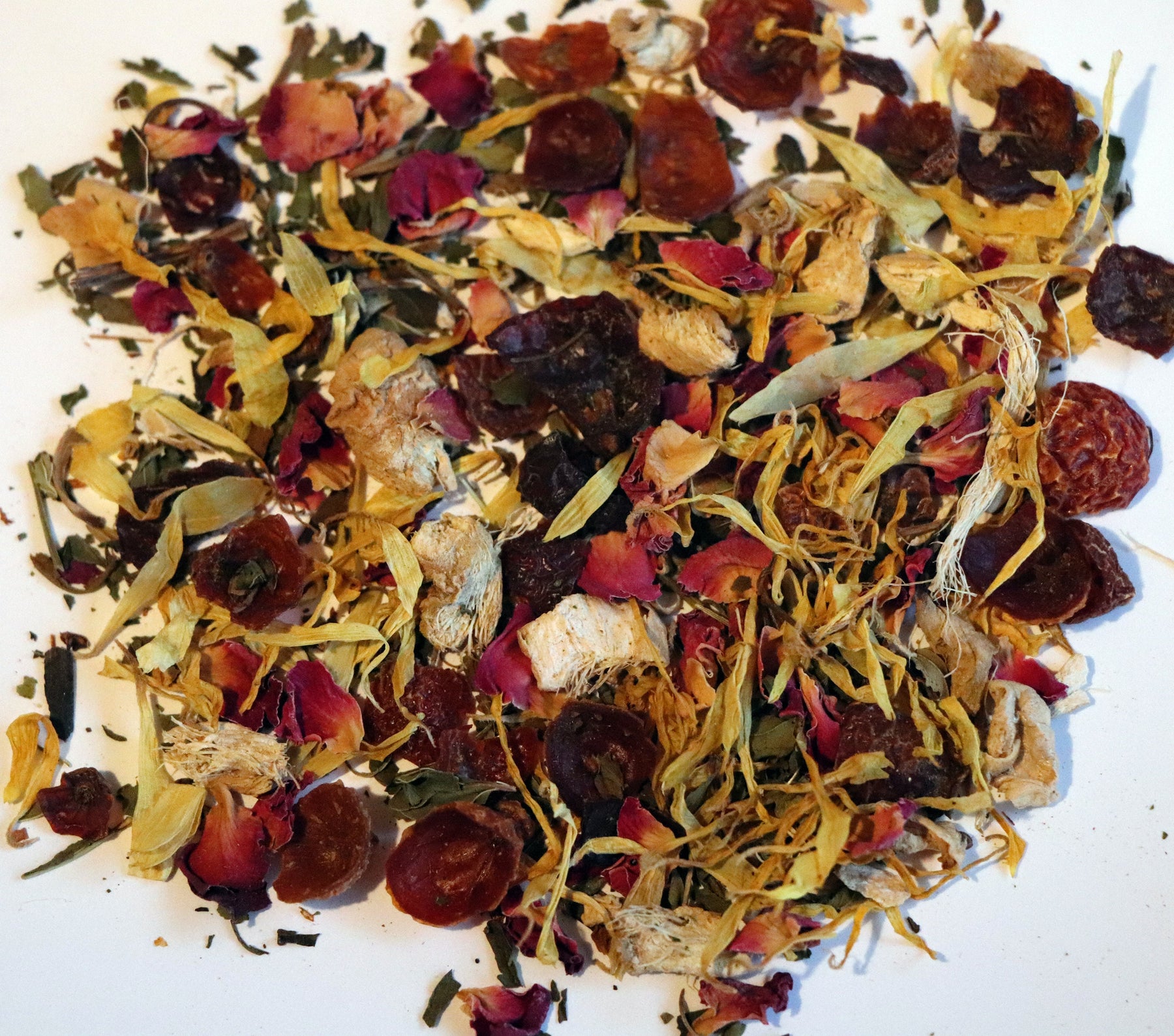 INGREDIENTS: Peppermint Leaves, Rosehip Pieces, Spearmint Leaves, Ginger Pieces, Rooibos Tea, Hibiscus Petals, Rose Petals, Calendula Petals and Osmanthus Petals.