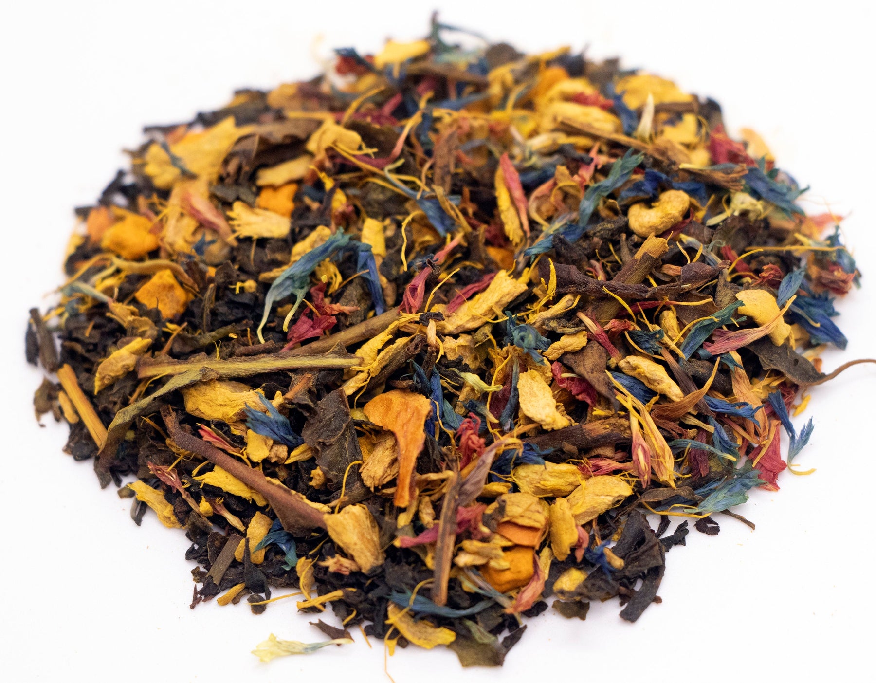 Ingredients: Green Tea, Black Tea, Bael Nut Pieces, Ginger Pieces, Turmeric, Red and Blue Cornflower Petals, Natural Flavors (Organic Compliant).
