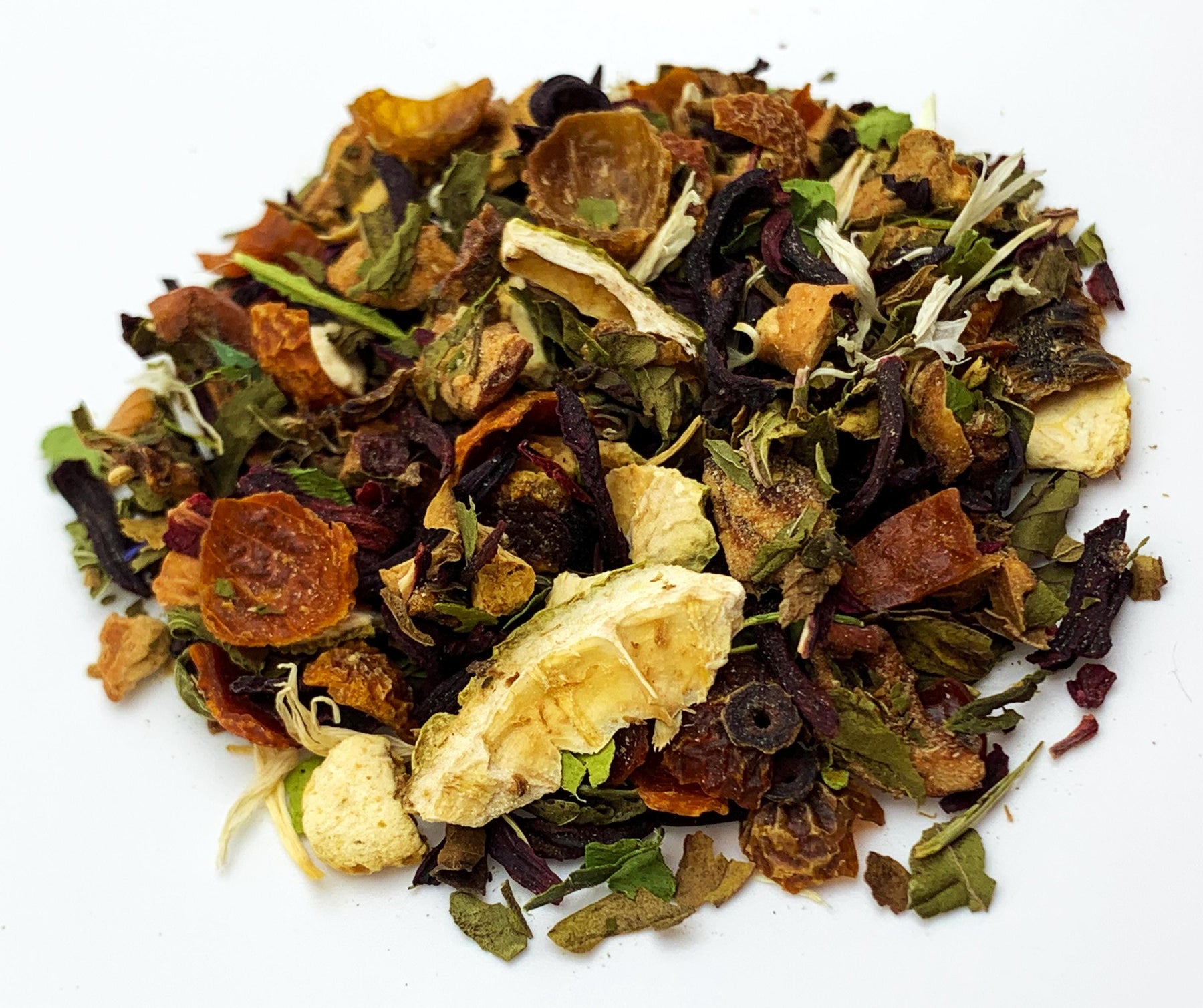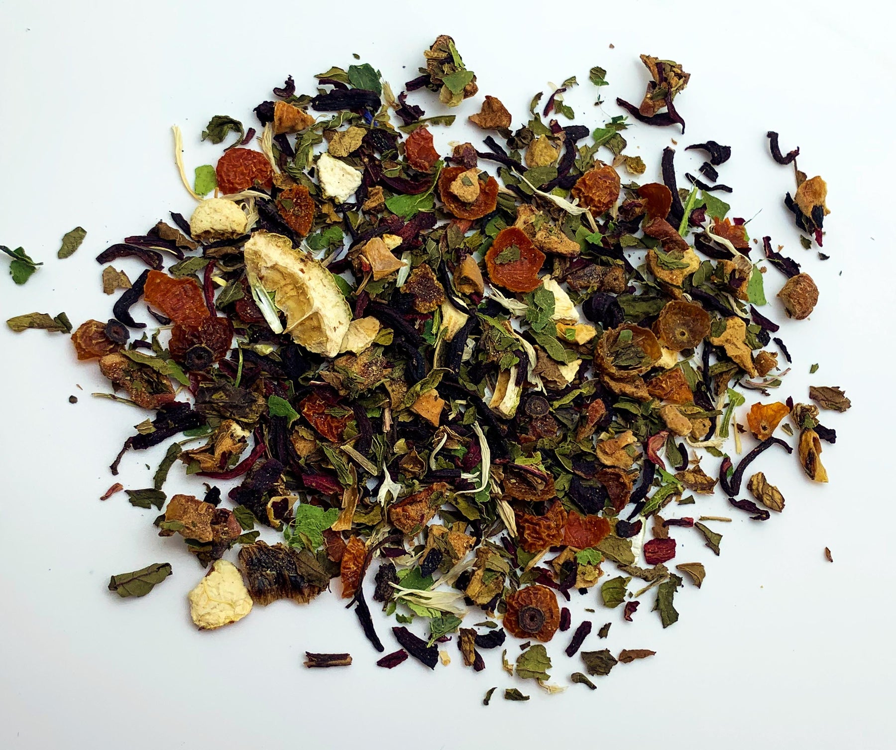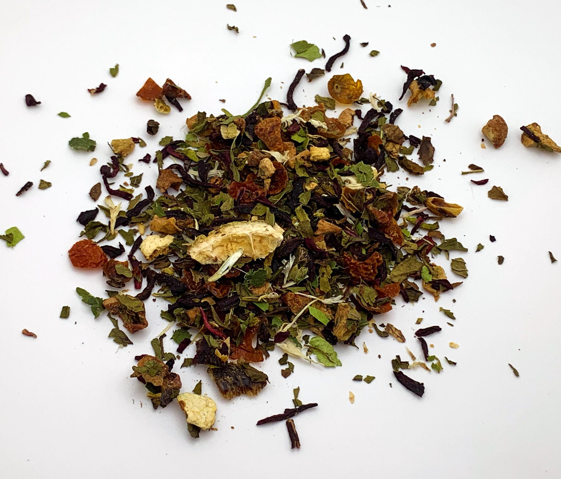 Ingredients: Hibiscus Petals, Apple Pieces, Peppermint Leaves, Rosehip Pieces, Orange Pieces, Lime Pieces, Lemon Pieces, Lime Leaves, Spearmint Leaves, Cornflower Petals
