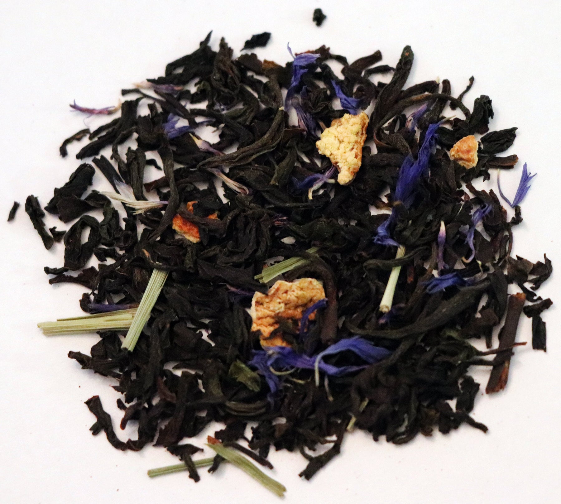 INGREDIENTS: Black Tea, Orange Pieces, Lemongrass Leaves, Cornflower Petals, Natural Flavors (organic compliant).