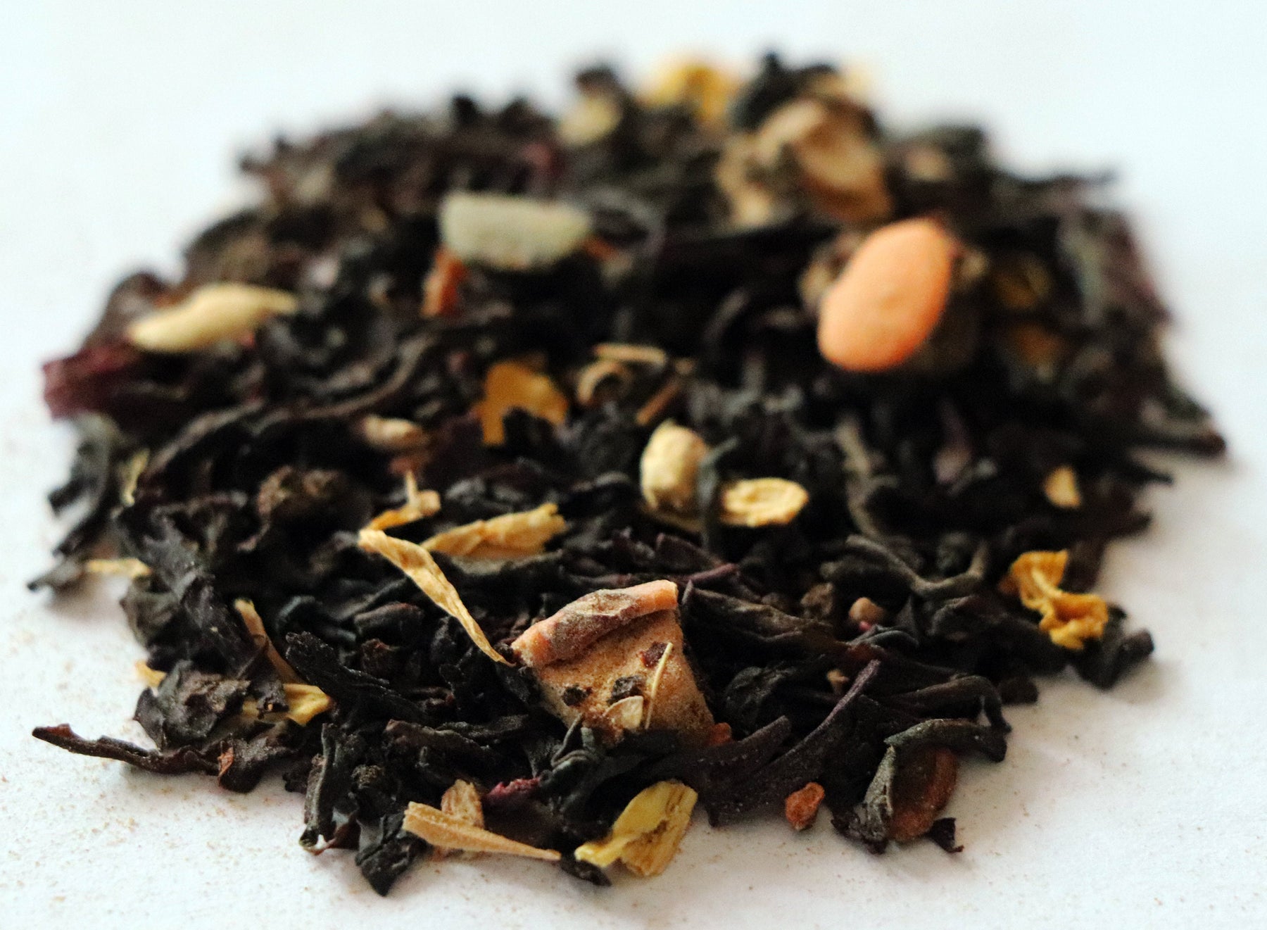 INGREDIENTS: Black Tea, Ginger Pieces, Cinnamon Pieces, Cardamom, Black and White Pepper, Clove, Nutmeg, Hibiscus Petals, Apple Pieces, Rosehip, Candy*, Calendula Petals, Sunflower Petals, Pumpkin Pieces, Natural Flavors (organic complaint) (*Candy: Sugar, Rice Flour, Vegetable Oil, Corn Starch, Confectioner Glaze, Arabic and Cellulose Gum, Carrageenan, Soy Lecithin, Yellow 5 + 6, Blue 1, Red 40) **Allergen Alert - Contains Soy**