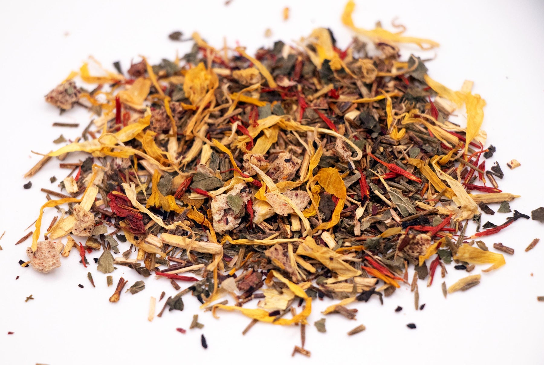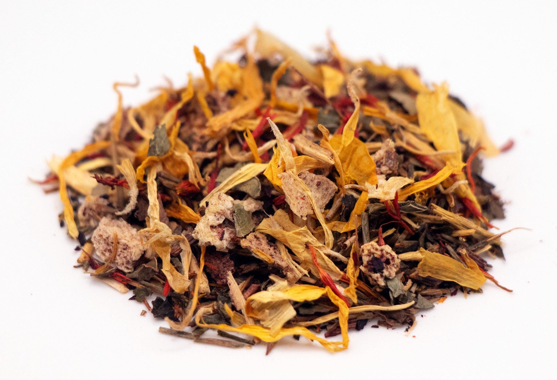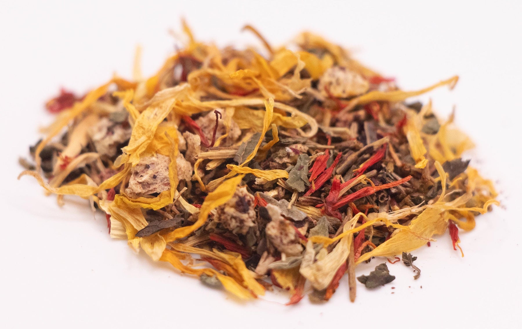 Ingredients: Green Rooibos Leaves, Hibiscus Petals, Licorice Root Pieces, Blueberries , Lemon Balm Leaves, Peach Pieces, Safflower Petals, Calendula Petals, Marigold Petals, Natural Peach Flavor