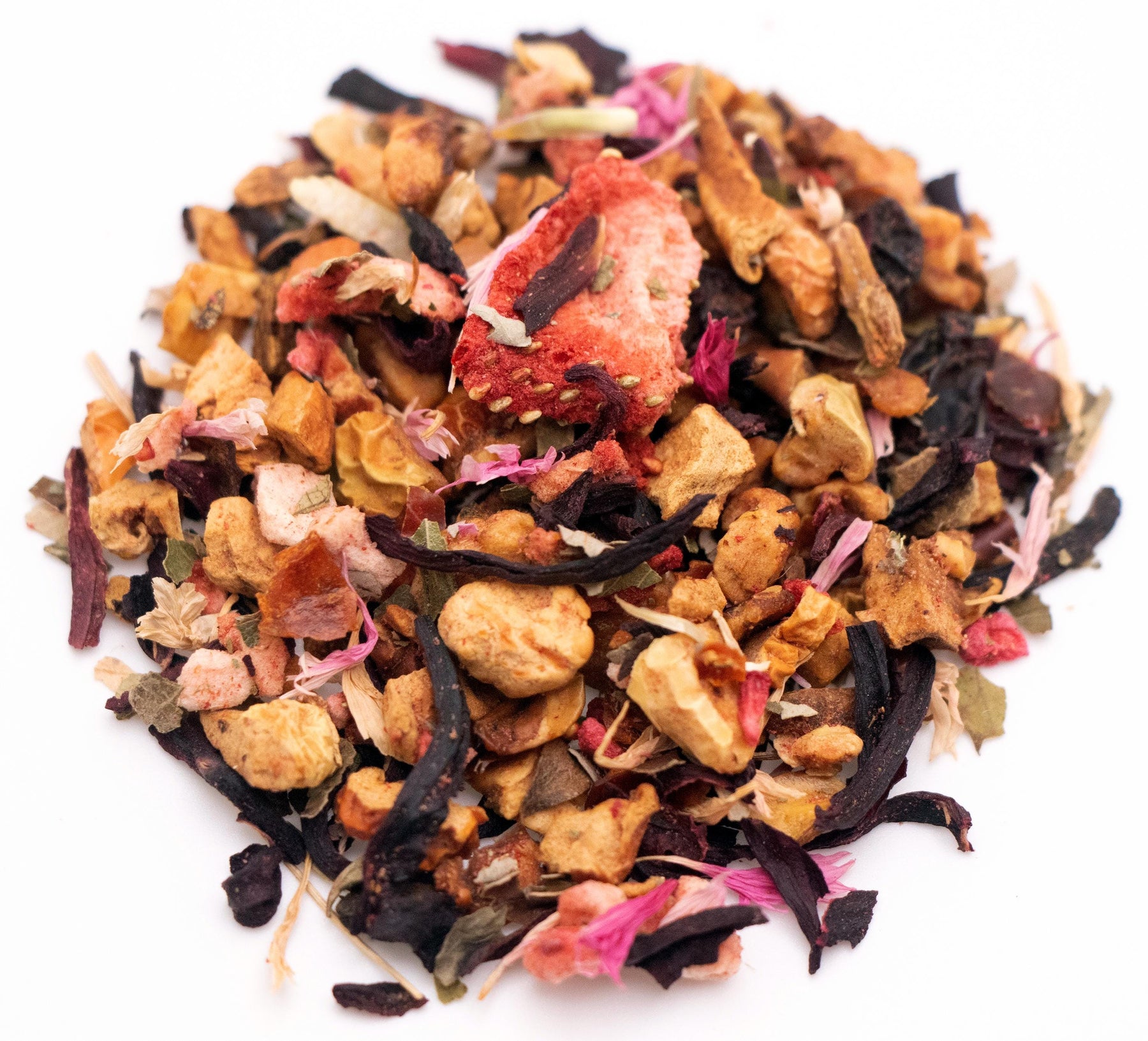 Ingredients: Apple Pieces, Hibiscus Petals, Rosehip Pieces, Currant Pieces, Blackberry Leaves, Turkey Rhubarb Root Pieces, Strawberry Leaves, Strawberry Pieces, Raspberry Pieces, Cornflower Petals, Natural Strawberry Flavor.